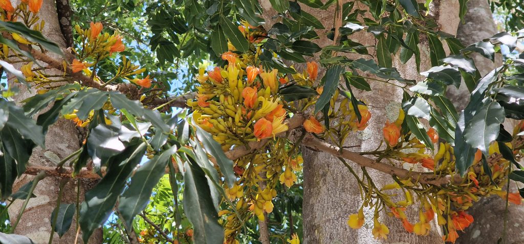 Zum Schluß schenkt uns Judy noch zwei riesige Weihnachtszapfen und einen Zweig von der Chestnut. Die Chestnut sind die kleinen Kapseln in dem Gesteck. Den Chestnut- Baum hatte ich in der Gärtnerei bewundert. Die Kastanien, auch Schwarze Bohmen genannt, wurden von der Aborigines zu Mehl verarbeitet.Das Holz fand für Speere Verwendung. Die roten Blüten sind sehr schön. Die Nüsschen nimmt Judy gern für ihre Gestecke.