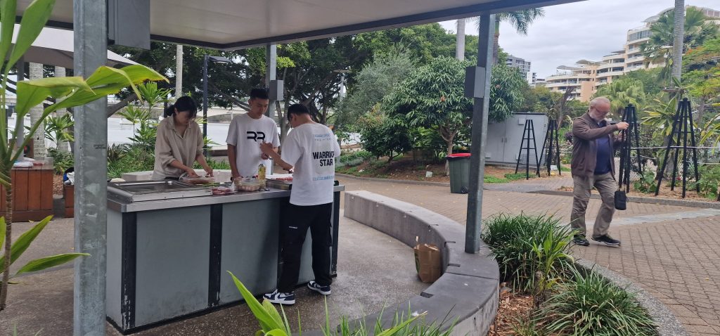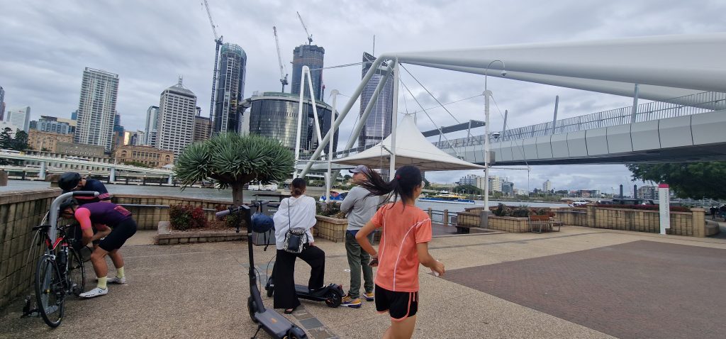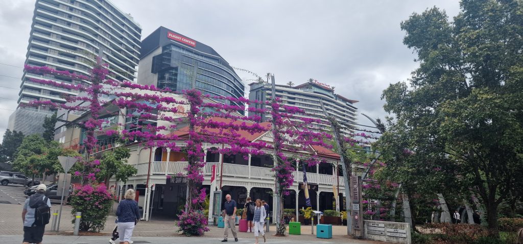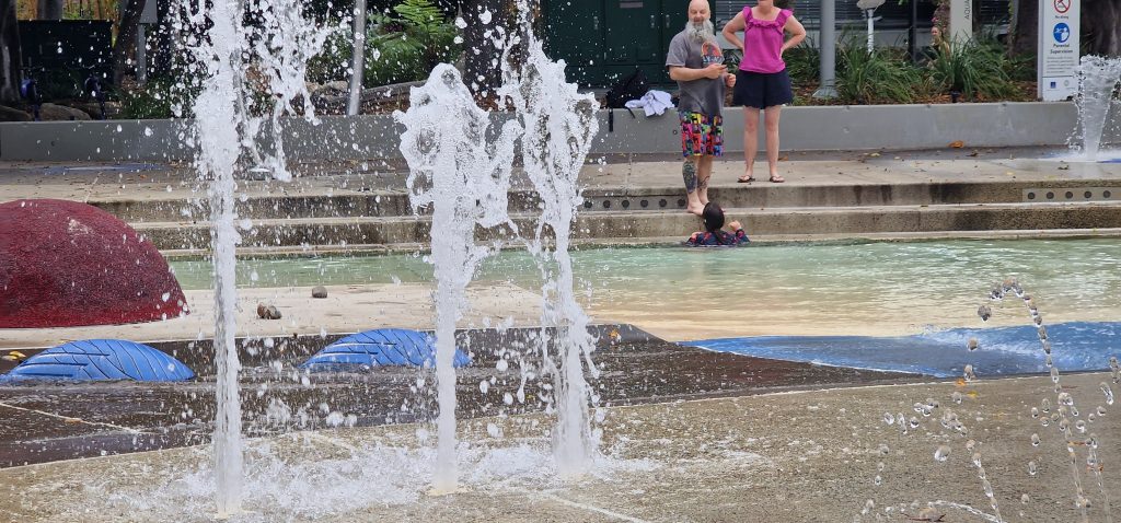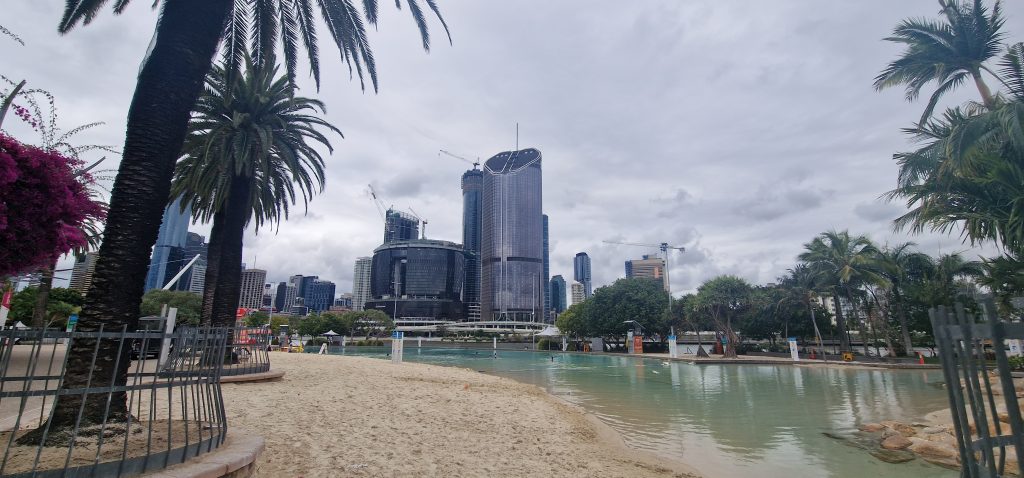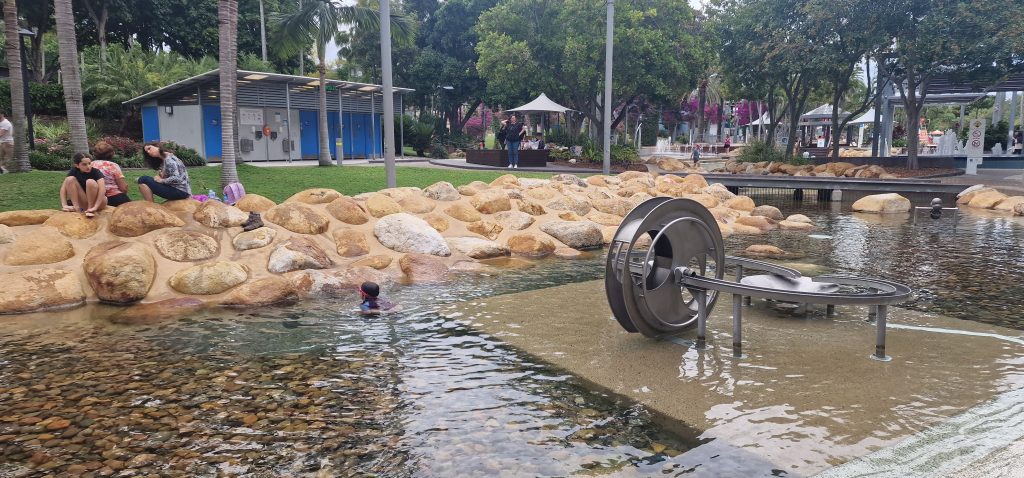 Unser Abenteuer beginnt, wir sind nun auf uns allein gestellt. Dass wir in Brisbane gelandet sind, ist bloß unserer ahnungslosen Flugbucherei von zu Hsuse aus zu verdanken. So sagt der Reiseführer auch, dass man Brisbane bequem auslassen kann. Aber Cottbus kann man ja auch auslassen zwischen Berlin und Dresden. Nachdem wir den Weg vom Flughafen zum Flughafenhotel gefunden und gelaufen sind ( det is nich wie in Schönefeld, sondern ziemlich größer), uns eingecheckt und erfrischt haben, schwärmen wir zur Erkundung der Stadt aus. Und was sollen wir sagen, schön ist sie, am großen Fluß gelegen, mit einer imposanten Skyline und einem faszinierenden Park am Fluss.Nicht nur die sauberen Toiletten, der Gasgrill, der Abenteuerspielplatz, der Regenwaldpark sind frei, auch das wirklich geile, künstlich angelegte Freibad neben dem Fluss mitsamt Wasserspielplatz (South Bank Park). Wer braucht da noch einen Infinitypool?! Und bei Ben und Jerry gibt’s bestes Eis.