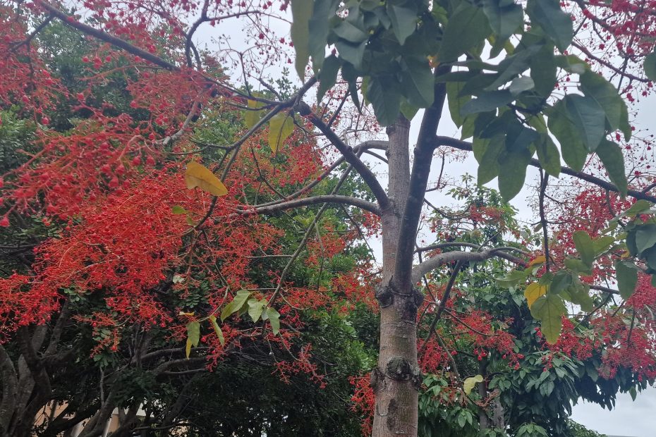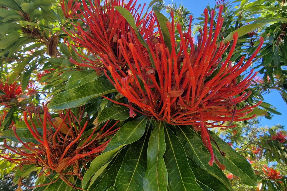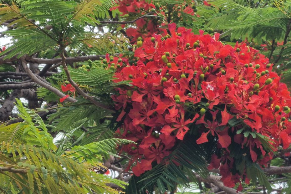Dank einer Tafel im Park kann ich nun den Flammenbaum identifizieren, den ich schon oft bewundert habe. Brachychiton acerifolius ist ein großer Baum aus der Familie der Malvengewächse, wächst in tropischen und subtropischen Regionen an der Ostküste Australiens. Er ist berühmt für seine leuchtend… Der Flammenbaum blüht