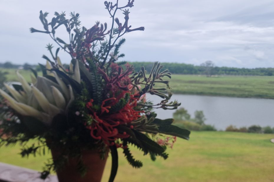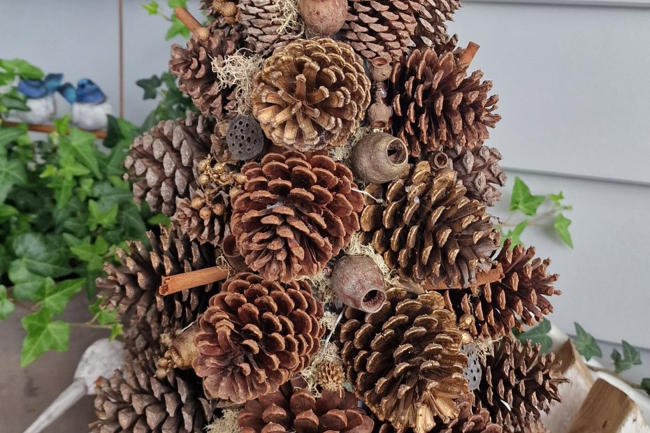 Zum Schluß schenkt uns Judy noch zwei riesige Weihnachtszapfen und einen Zweig von der Chestnut. Die Chestnut sind die kleinen Kapseln in dem Gesteck. Den Chestnut- Baum hatte ich in der Gärtnerei bewundert. Die Kastanien,… Australische Chestnut