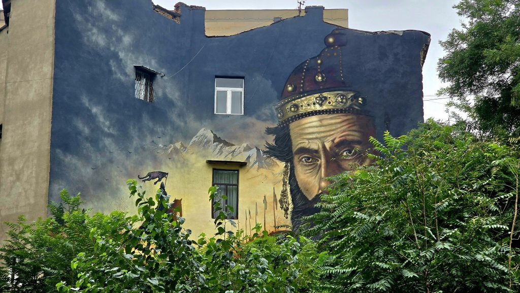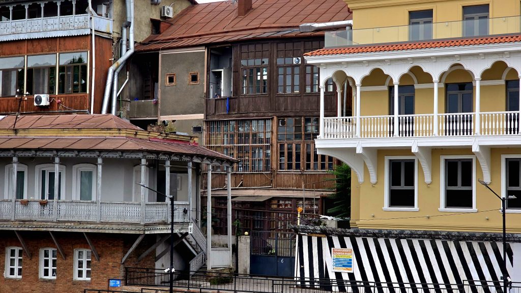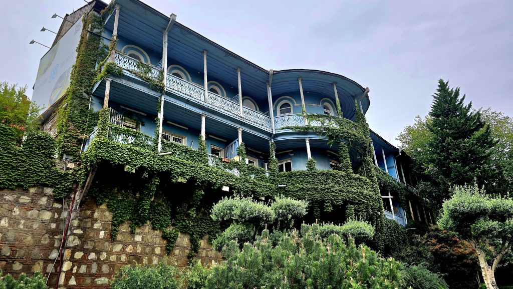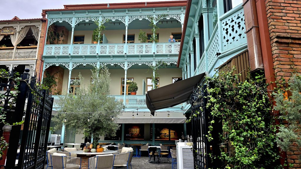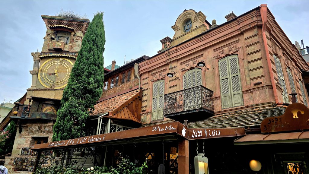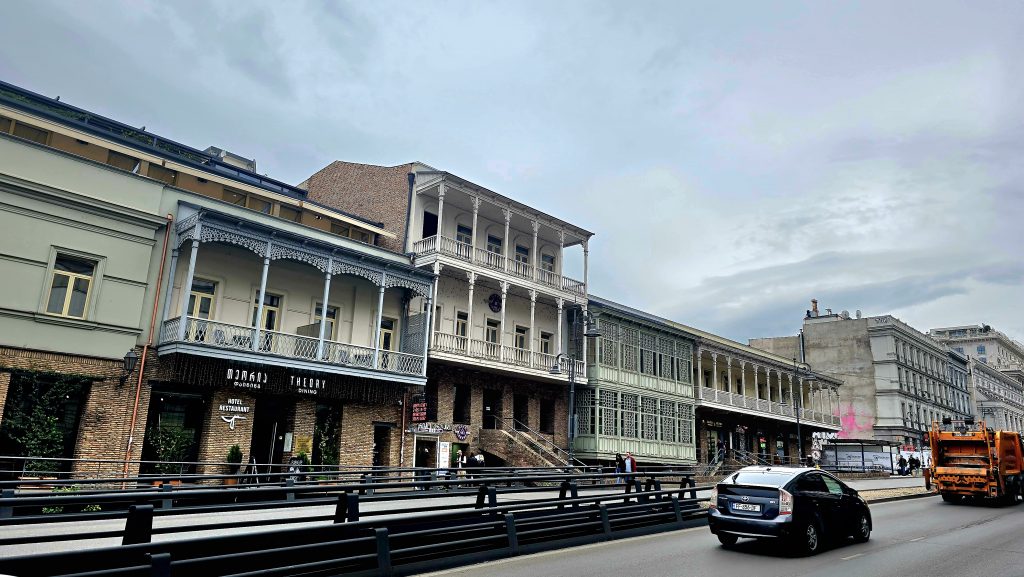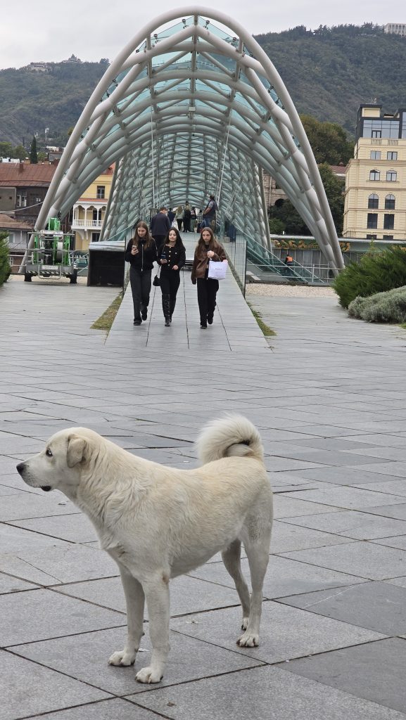 Für mich bitte das erste. Denn Reiner hatte keine Gute Nacht. Außerdem kamen 0 Uhr (!!!!) Bauarbeiter, rissen ein Stück Straße auf, teerten sie neu und fuhren mit der Walze drüber. Die Hunde bellten dazu. Das Duschwasser blieb kalt. Wie froh fuhren wir am Morgen von dannen. Nun fährt es sich aber nicht ganz leicht durch Tblisi, Hauptstadt mit über 1 Million Einwohnern, vollgestopften Straßen, schmalen Gassen steil bergauf! Wir suchten und fanden einen freien Parkplatz. Wir liefen runter zum Fluss Kura. Er durchzieht die Stadt, kommt vom Kaukasus und mündet im Kaspischen Meer. Über ihn spazierten wir auf einer schicken Brücke, der Friedensbrücke, und erreichten schon etwas von der Altstadt, für die Tblisi so bekannt ist.