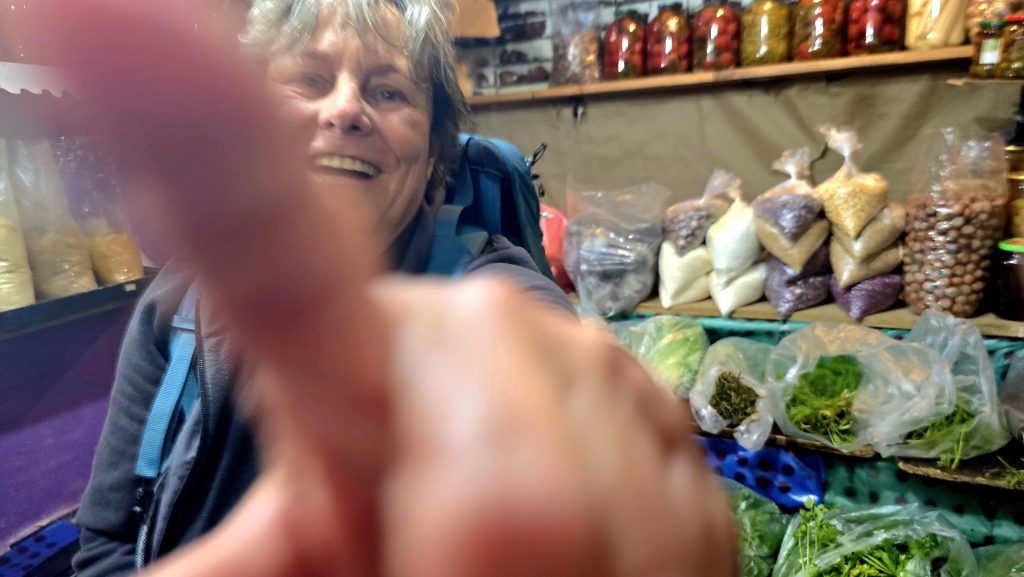 Ein großer Blumenmarkt und ein kleiner Gemüsestand begeistert uns. Ich fotografiere die Chinesische Dattel, die ich bisher nicht kannte, und kaufe sie auch brav und bezahle gut, da macht der Händler auch ein nettes Foto von mir mit Hand auf der Linse:
