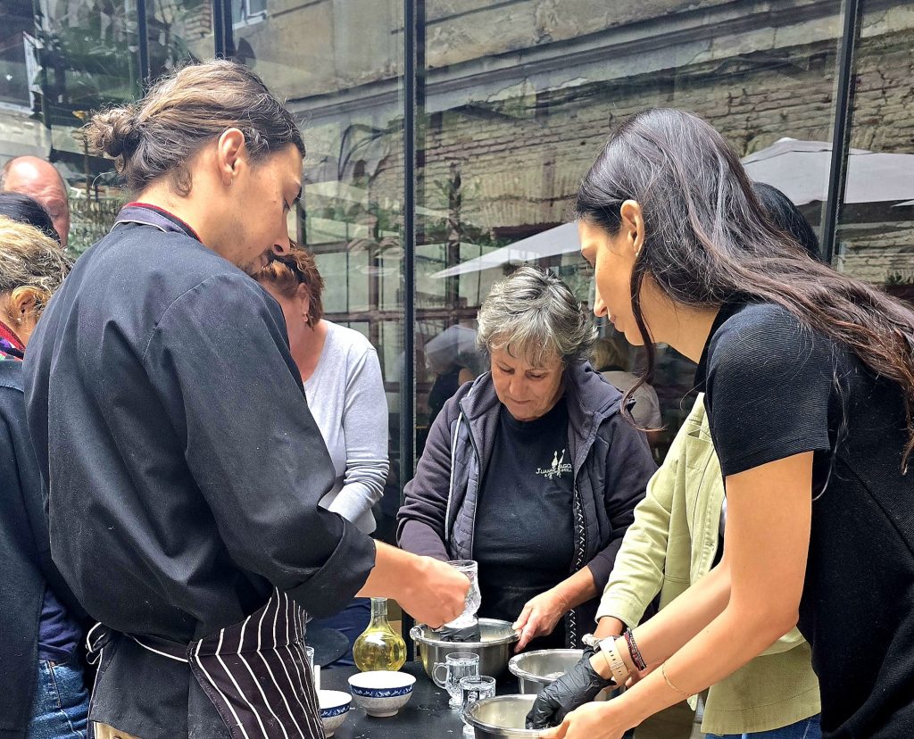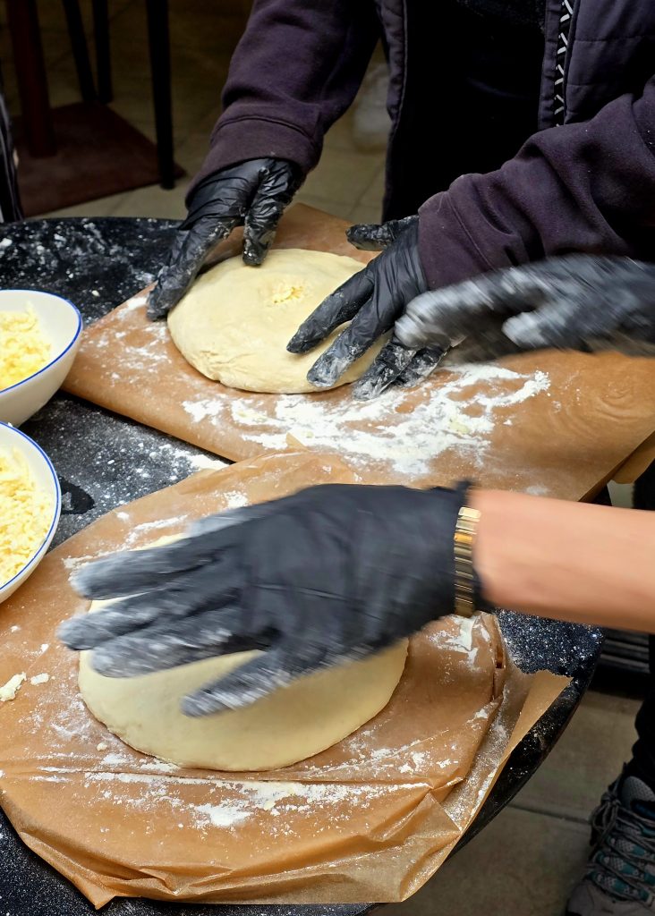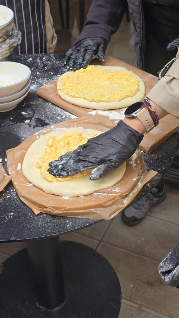 Dann war schon der Nachmittag ran und wir besuchten eine Koch- Veranstaltung, wahlweise in englischer oder russischer Sprache zu buchen. Eine junge Frau aus New York, eine aus Norwegen, eine aus Düsseldorf, zwei grade in Italien lebende Menschen, ein Paar aus- ich habs vergessen- und ein weiteres Paar aus Norddeutschland und wir beide „kochten“ miteinander. Wir rührten den Chatschapuri- Teig (gefülltes Brot) an.