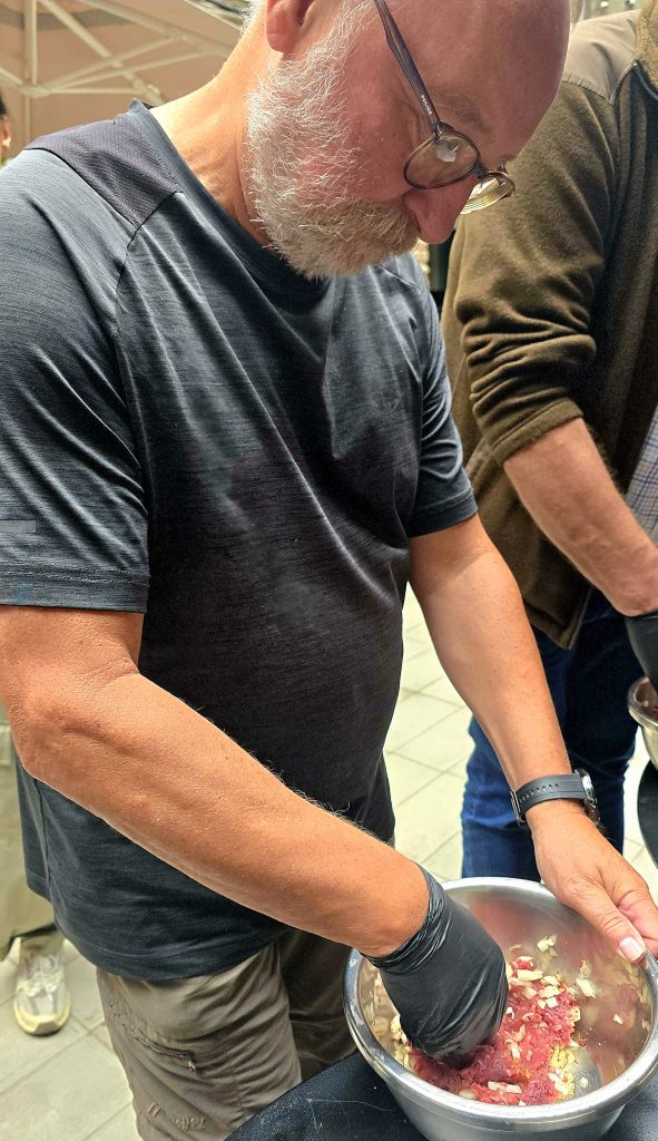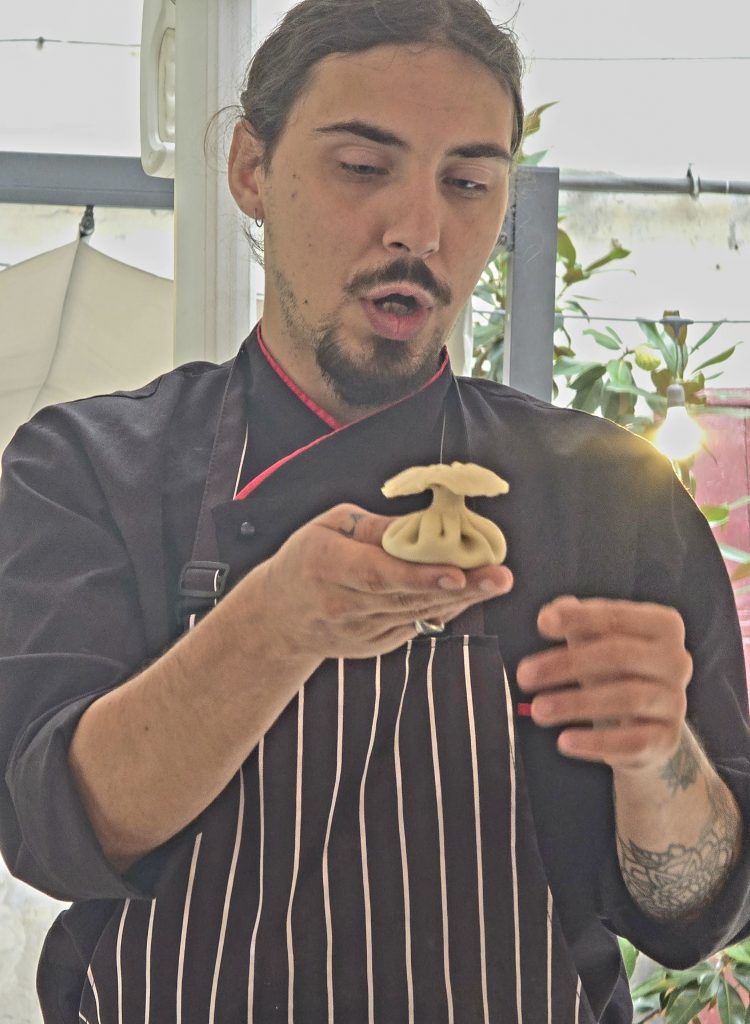 Unser Chef erklärt geduldig, wie wir den Teig formen sollen und für die, die nicht alles verstehen- wie ich- kommt er rum und macht vor und ich mach nach