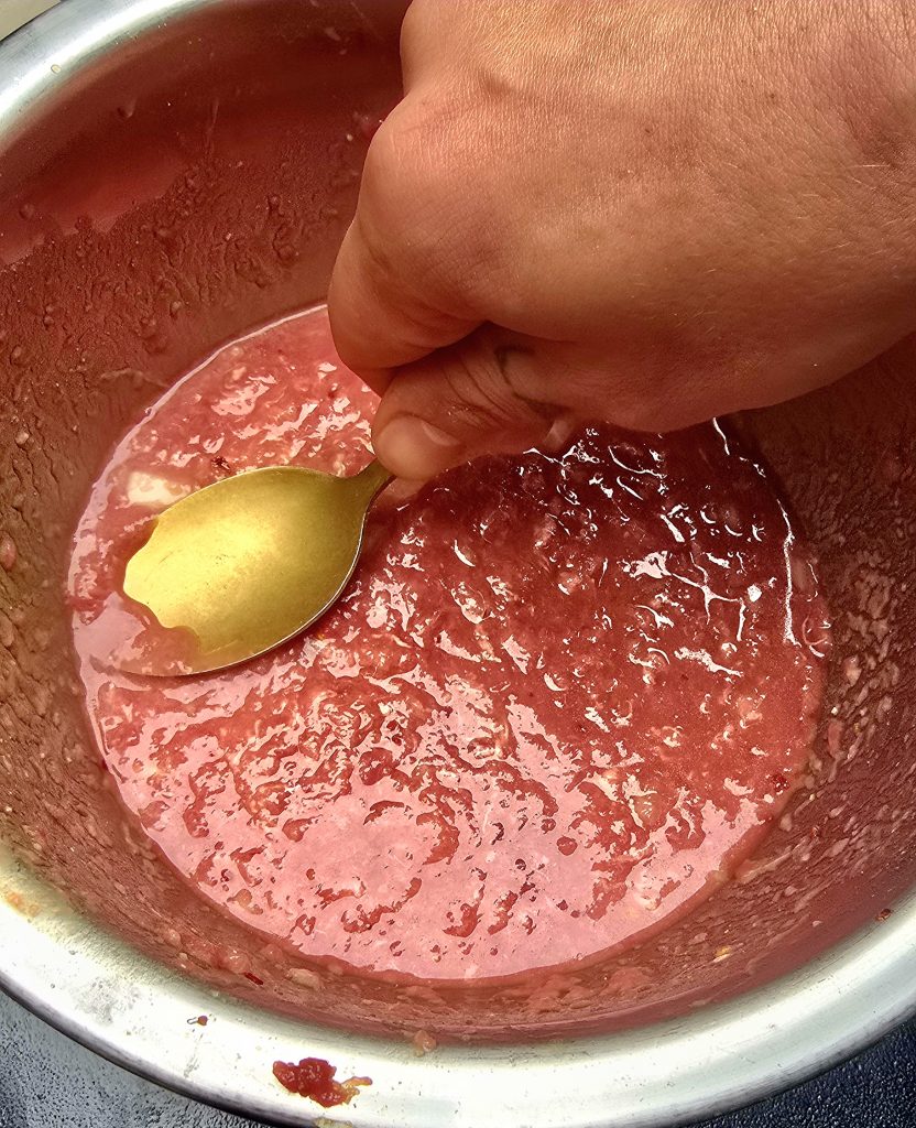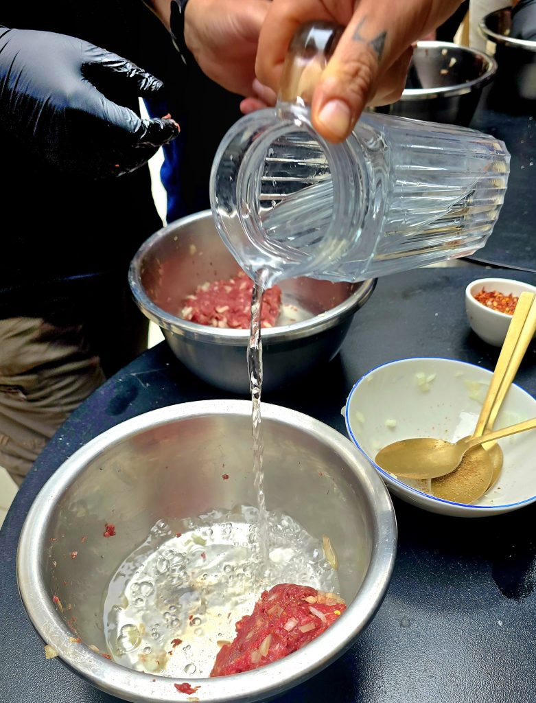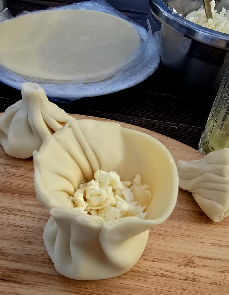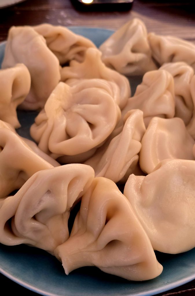 Dabei lernte ich, dass dem zu klebrigen Teig fett Öl zugegossen wird, damit er schön fluffig wird und nicht mehr an der Schüssel klebt. In der Zeit, da der Teig in der Küche gehen durfte, durften wir die Chinkali- die Teigtäschchen- formen und füllen. Die Rindfleischfüllung gossen wir kräftig mit Wasser an, klar, damit die Täschchen auch von innen schön weich werden.