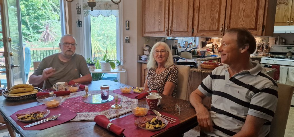 Weil ich nicht mehr schlafen kann ( zu Hause ist sch Mittagszeit) stehe ich 6 Uhr auf, koche mir einen Kaffee und übe Englisch. Alsbald kommt Donna und bereitet aus dem Teig, den der Brotbackautomat gerührt und gehen lassen hat, Cinamon Buns- Zimtschnecken, gefüllt mit eben mit Zimt, Butter, braunem Zucker, aber auch Nüssen und Rosinen. Die Buns genießen wir nach Ham und Eggs mit Toast.
