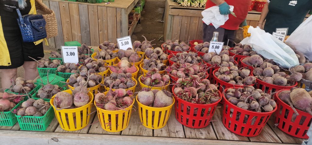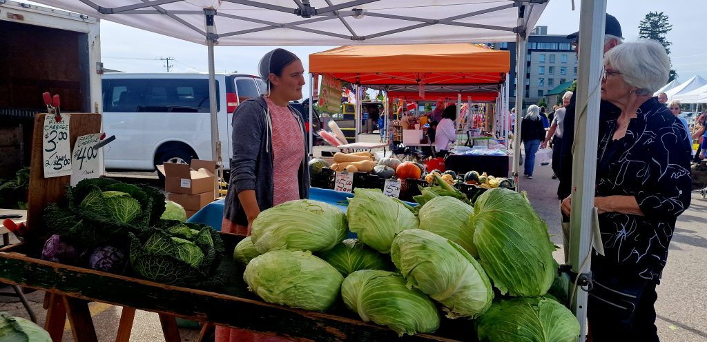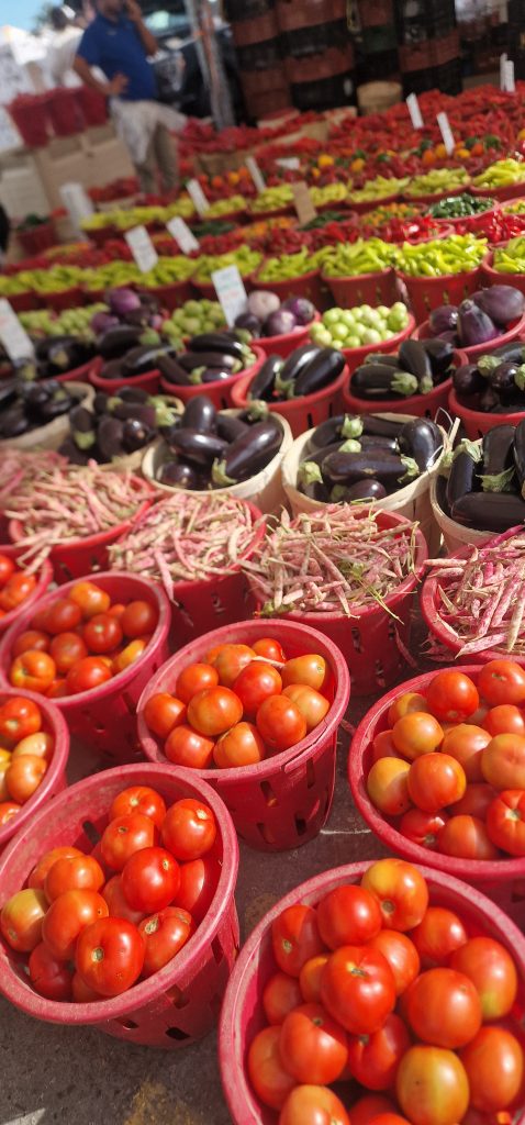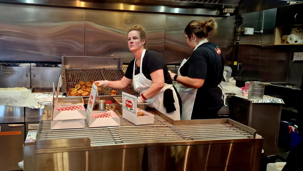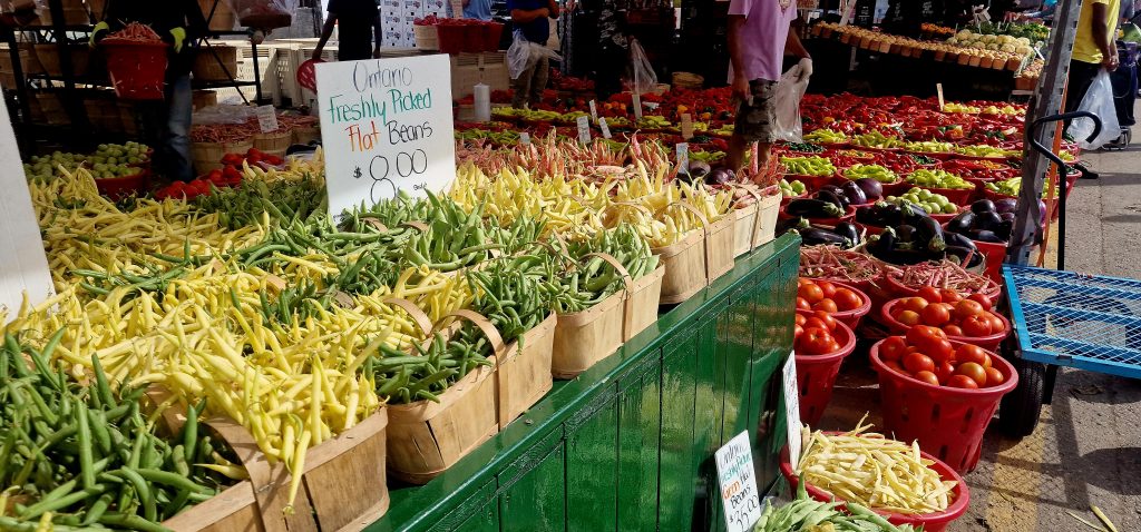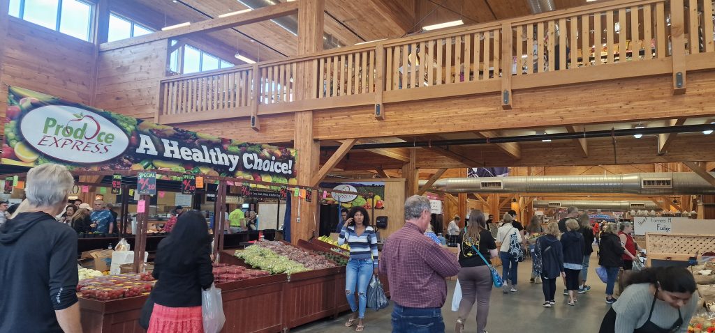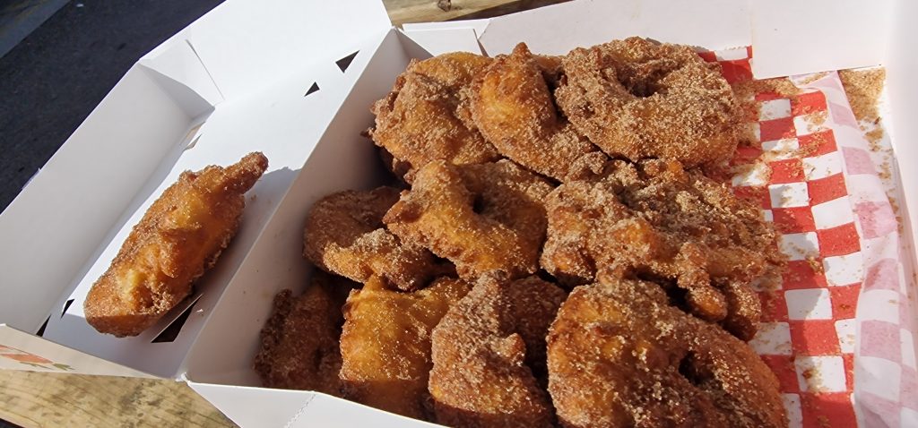 Wir fuhren auf den Farmers Market.Wir essen Apple Fritters, in Teig frittierte Apfelringe.Tasty!