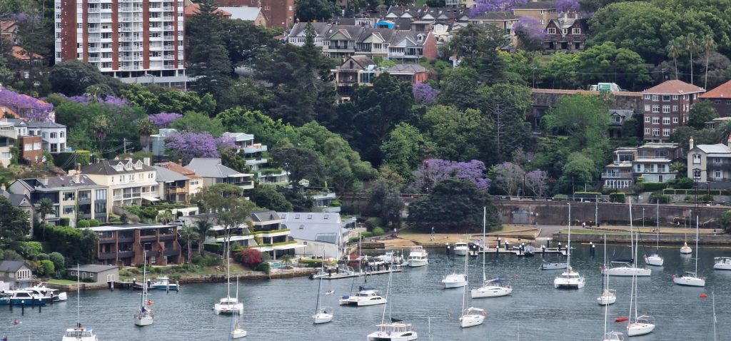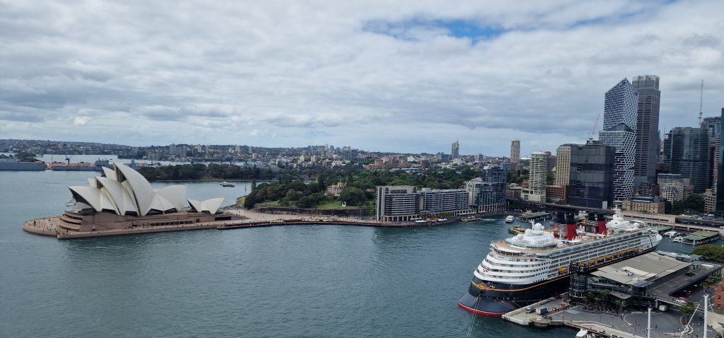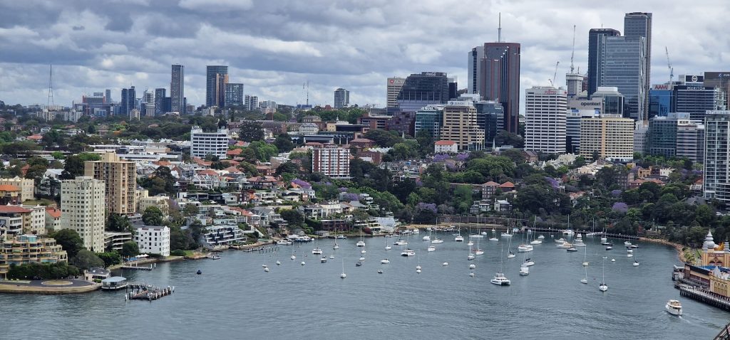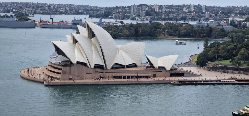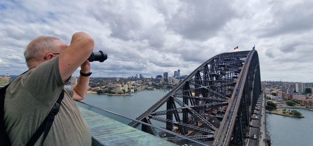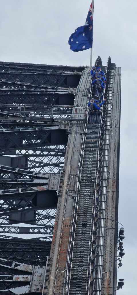 Nachdem wir die Belgische Waffel und den Kuchen genossen hatten, wanderten wir zur Harbour Bridge. Sehr, sehr viele Läufer mit Trinkflaschenwesten müssten sich ebenfalls den Berg hinauf. Die 1932 eingeweiht Brücke ist eine der längsten der Welt, die nur aus einem Bogen gespannt ist. Wir stiegen die 200 Stufen auf eine Aussichtsplattform im Südostpylon hinauf, genossen die prächtige Aussicht und bewunderten die Brückenkletterer nebenan, die auf dem Bogen lang klettern.