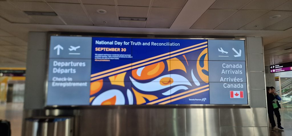 …dass die Engel reisten, liegt sicher auch am 30.09. Es ist der Tag der Wahrheit und der Versöhnung der sehr verschiedenen Menschen in Kanada mit ihrer kolonialen und nachkolonialen dunklen Geschichte. An diesem Tag trugen viele Menschen zur Erkennung das Orange T- Shirt “ Every child is matters“ – jedes Kind ist gleich. (Ich hatte es leider nicht gekauft,obwohl es mir gefiel.).Ich gebe sehr viel dafür, dass in Deutschland solche überlebensgroßen Plakate hängen bleiben, nicht beschmiert und selbstverständlich werden wie in Kanada. Es steht drauf, die Welt ist bunt und die Menschen sind verschieden. Ich glaube, im Moment würde „man“ das in Deutschland für einen Schrubblerwitz halten, so deute ich die Wahlergebnisse. Meinen Briefwahlbrief fand ich heute im Briefkasten.Ich zeriss den Brief. Er war leider zu spät gekommen.
