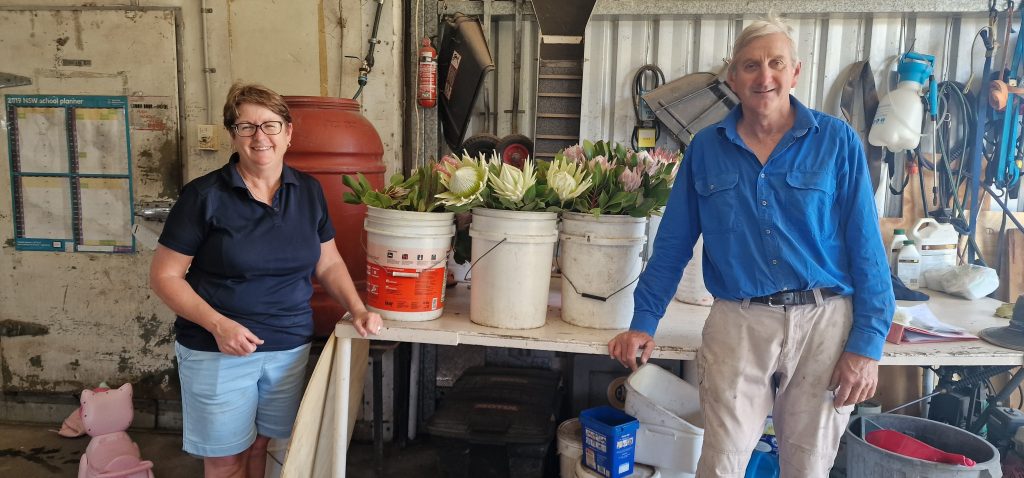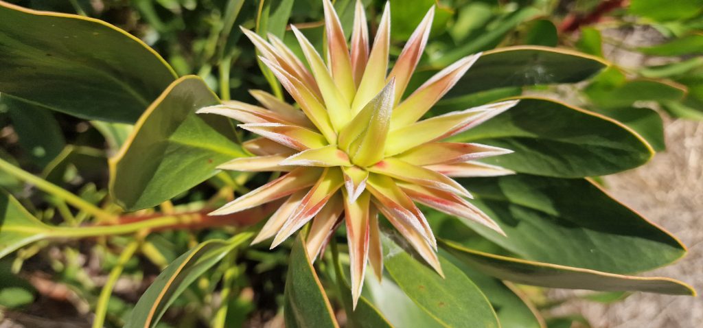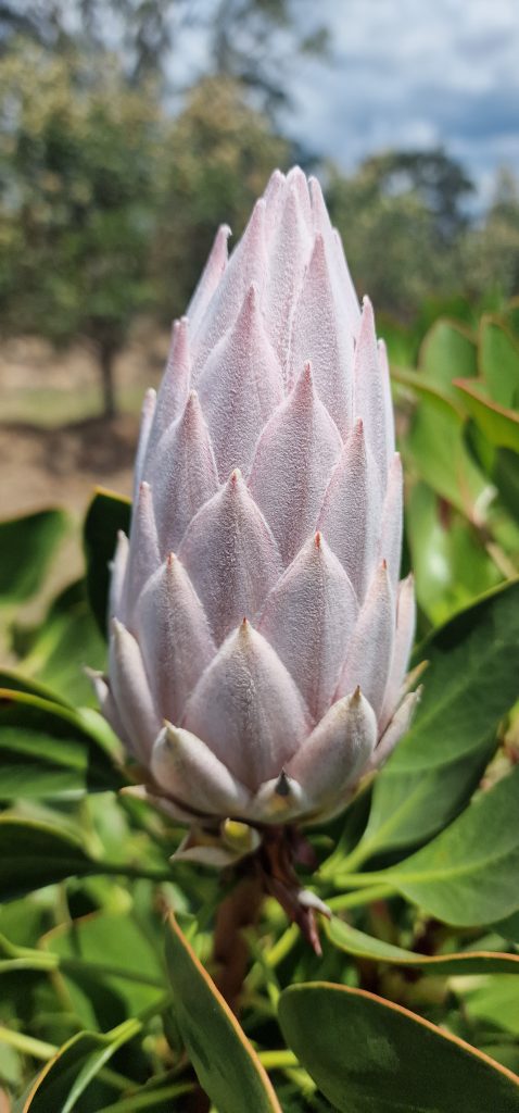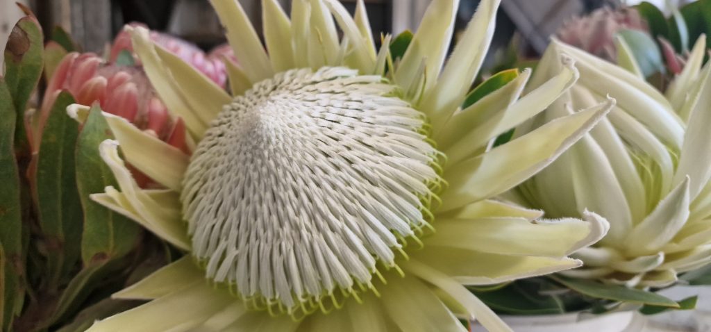 Besser: auf der Plantage genießen wir, was der anstrengende Alltag der Gärtner ist, die Blumen in der Weite des grade grünen Landes, denn es hat geregnet.Die Familie baut Proteen und den Weihnachtsstrauch an. 40.000 Proteen verkauft sie im Jahr. Hier hat Judy immer für ihren Laden eingekauft. Jetzt holt sie „nur ein Sträusslein“. Ich bin dankbar, das kennenlernen zu dürfen. Die Protea ist die Nationalblume Südafrikas und daher kenne ich sie schon gut.
