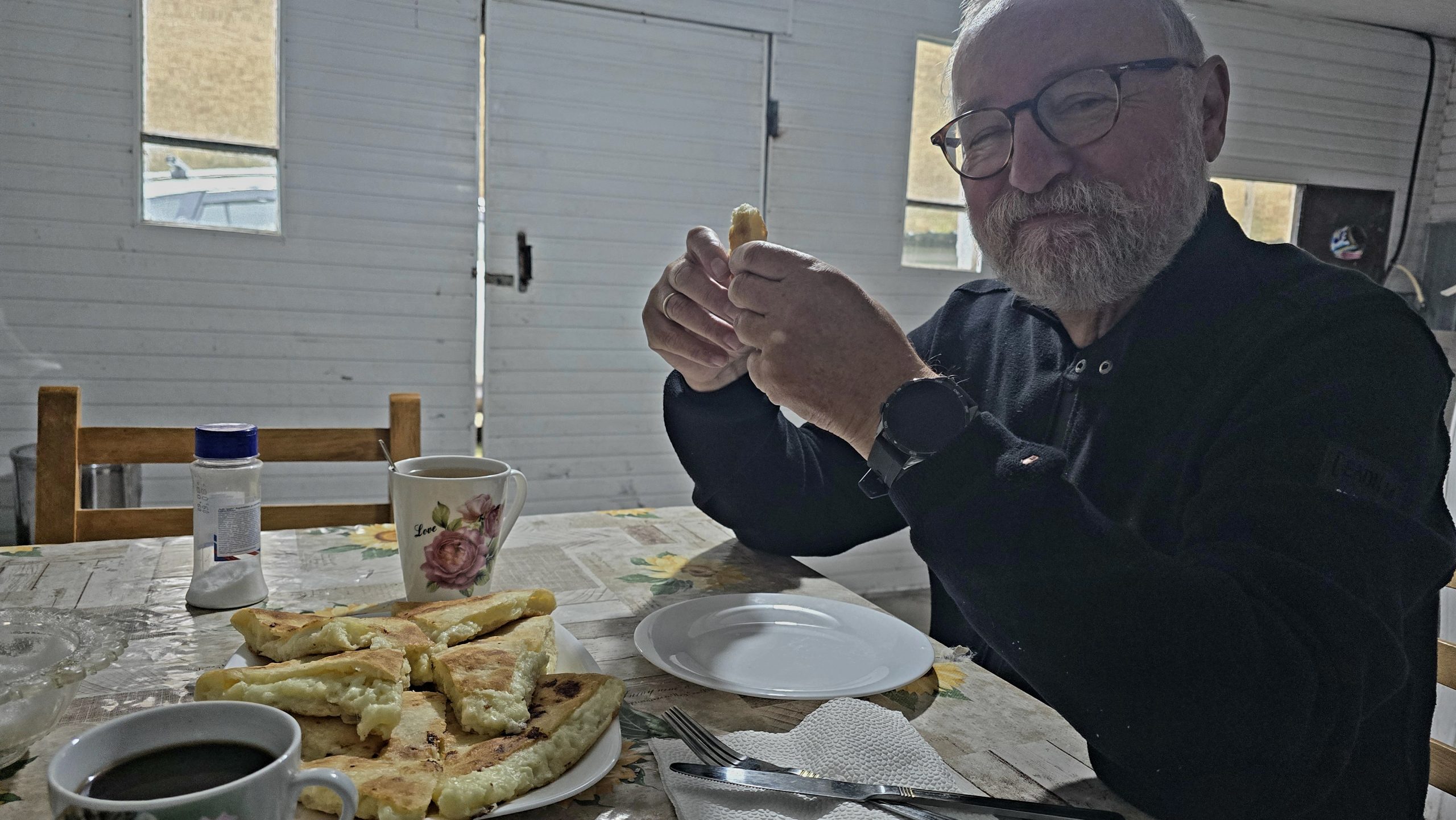 Fünf Minuten später kam der Hausherr mit Tassen, im nächsten Gang mit Teewasser und goss Reiner Früchtetee durch ein Sieb auf und die Hausherrin brachte mir türkischen Kaffee, aber ein kleines Tässchen. Dann brachte sie das frisch gebackene und reichlich mit Käse gefüllte Brot und das war`s.