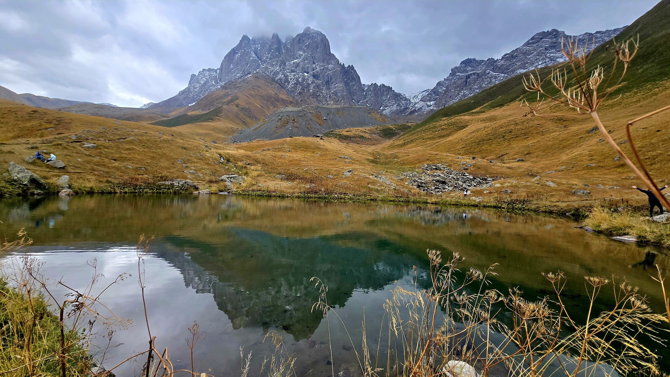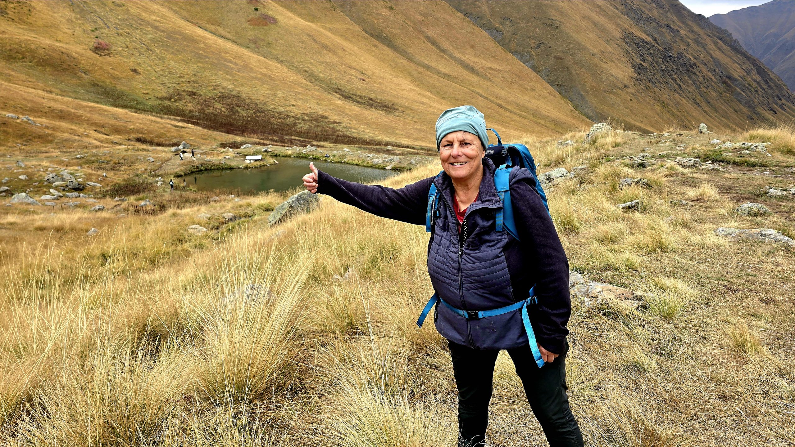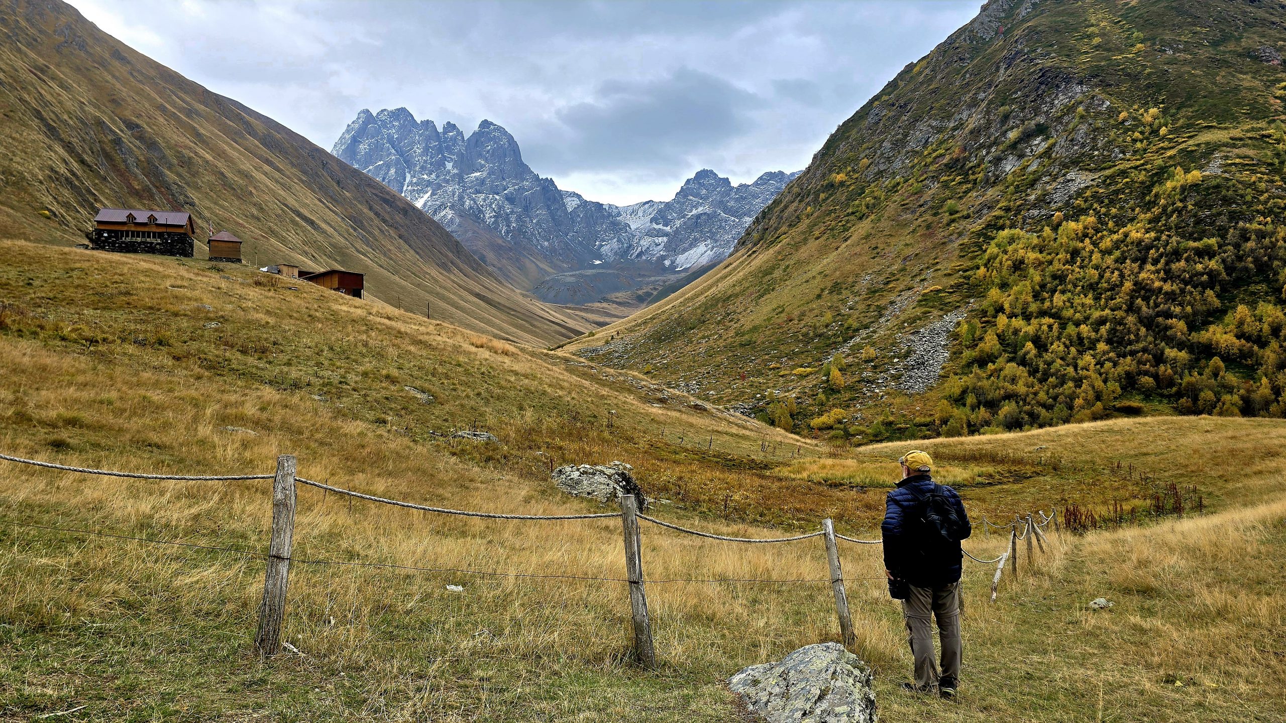 Gestärkt treten wir raus und Reiner grüßt die herein tretenden jungen Männer mit „Hello“. Schon fragen sie, woher, wohin. Eine deutschsprechender Georgier ist mit einem Stuttgarter unterwegs. Wir plauschen nett und Ich sage, „Sie holen uns bestimmt wieder ein“ und so kommt es, denn wie der Georgier prophezeit hat, geht es zum Chaukhi Lake „weiter rauf“. Also wieder viel stehen bleiben, Luft holen, fotografieren, andere Wanderer vorbei lassen.