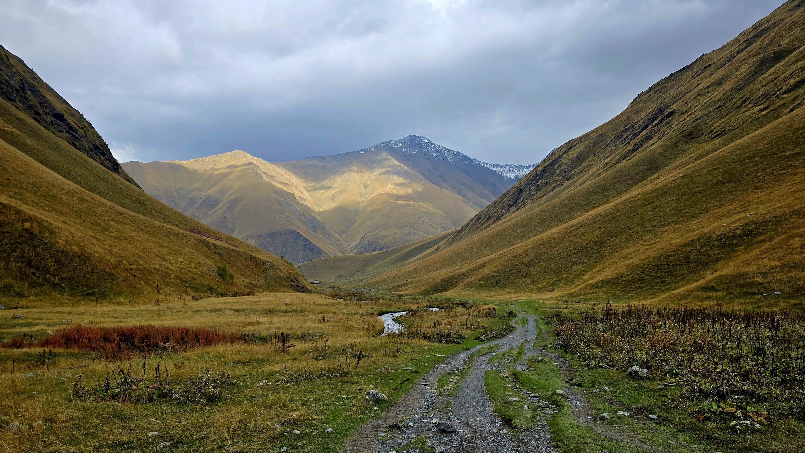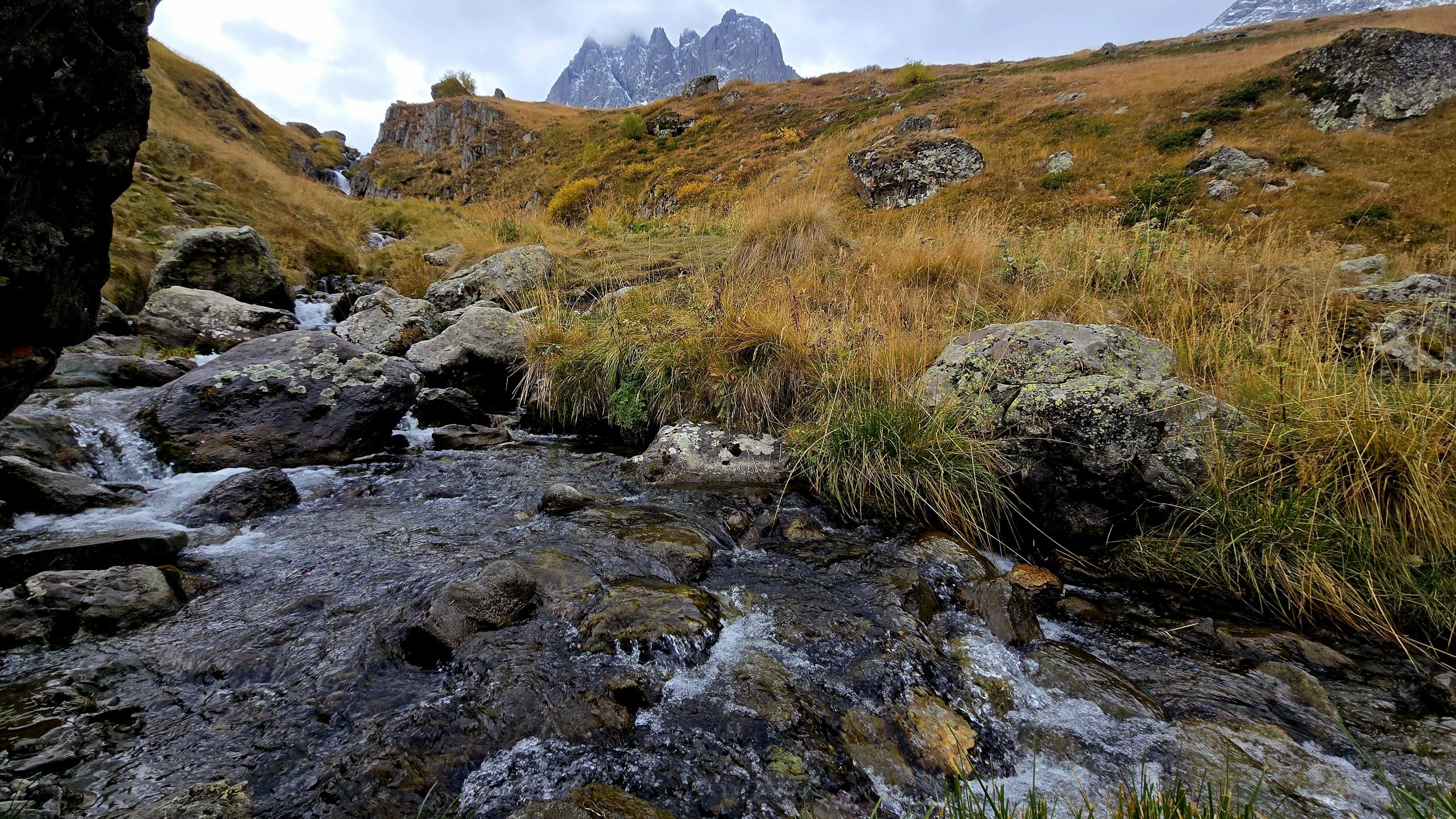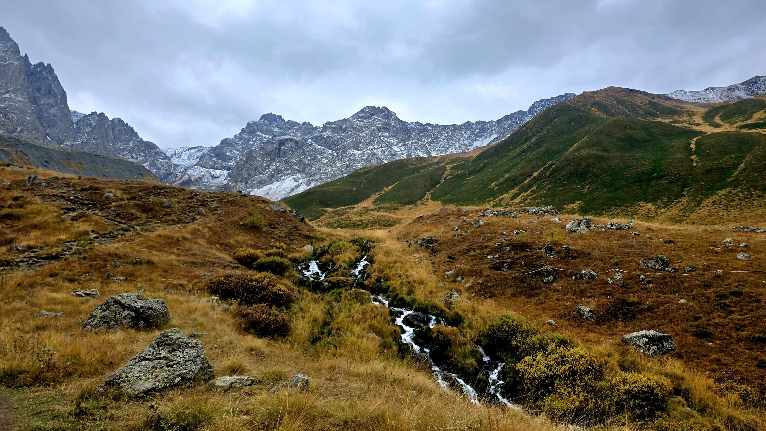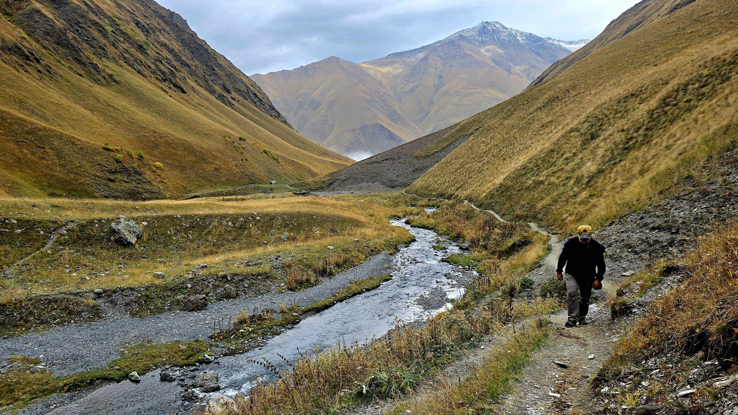 Gestärkt treten wir raus und Reiner grüßt die herein tretenden jungen Männer mit „Hello“. Schon fragen sie, woher, wohin. Eine deutschsprechender Georgier ist mit einem Stuttgarter unterwegs. Wir plauschen nett und Ich sage, „Sie holen uns bestimmt wieder ein“ und so kommt es, denn wie der Georgier prophezeit hat, geht es zum Chaukhi Lake „weiter rauf“. Also wieder viel stehen bleiben, Luft holen, fotografieren, andere Wanderer vorbei lassen.