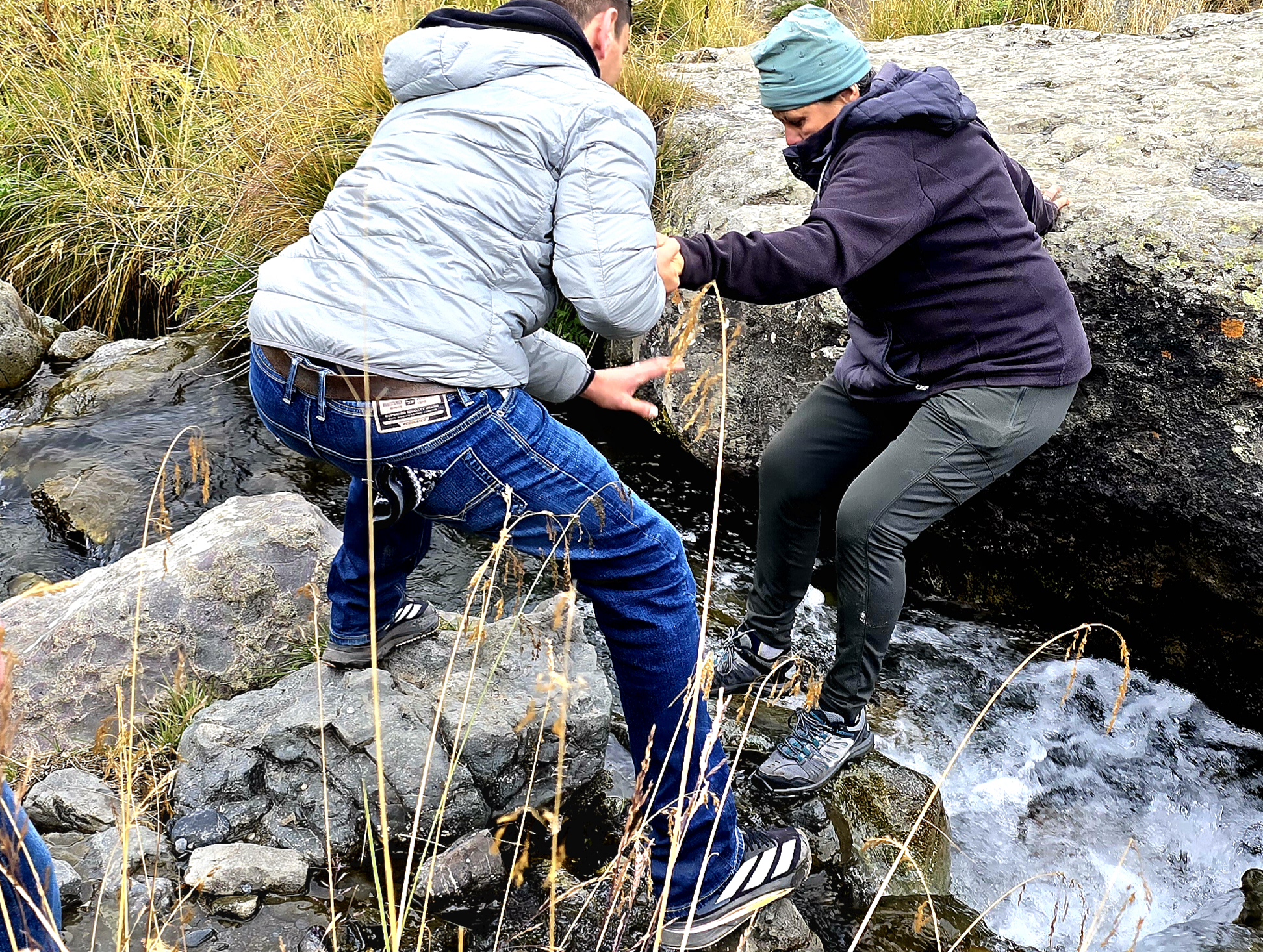 Am Waserfall fotografieren wir zunächst schön, bis wir begreifen, dass wir da rüber kommen müssen. Zum Glück kommt grade unsere Bekanntschaft vorbei und hilft mir, rüber zu kommen. „Bleiben Sie entspannt“ „Rück zu wird leichter“- der Georgier hat Übung in positiver Motivation und ich schaffe es.