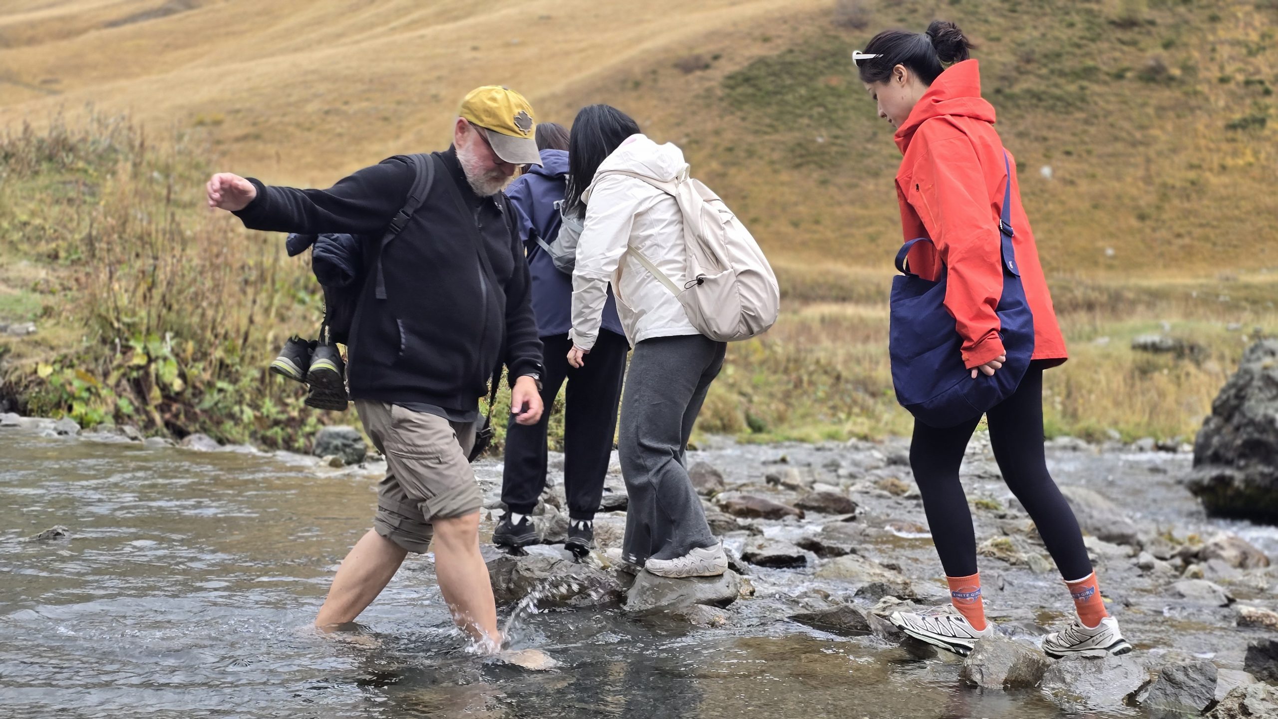 Wir beschließen, auf der anderen Seite des Tals runter zu wandern. Schon ziemlich weit unten entpuppt sich auch hier die Wanderung zu einer Aufgabe mit zusätzlichem Schwierigkeitsgrad. Alle balancieren auf den Steinen durch das Wasser. Uns ist das nichts. Denn erstens kann man ausrutschen und zweitens nicht nur nass werden, was nicht so schlimm wäre, denn das sind wir schon von der ersten Überquerung, sondern man kann auch fallen und sich dabei verletzen derart, dass es sehr weh tut und es einen Arzt braucht und man nicht laufen kann etc. Solche Filme haben wir „alten“ Wanderer, vor allem ich, die einmal ein gebrochenes Sprunggelenk hatte, im Kopf. Unser Wanderfreund aus Südkorea zieht seine Schuhe aus und watet barfuß durch den Fluss- auf Nummer sicher- ja, das hatte mir auch so vorgeschwebt und fein, so machen wir das.