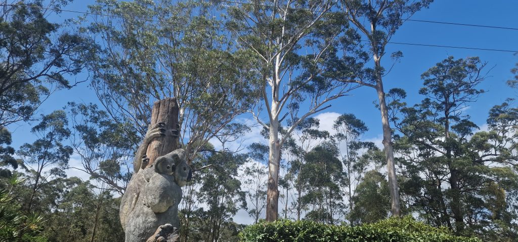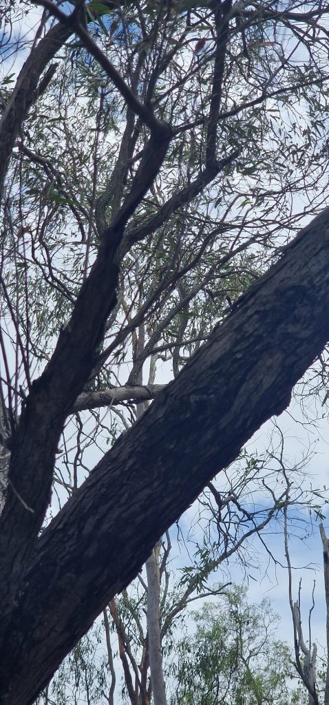 Der Pffegferminz- Eukalyptus, einer der 500 oder 600 Sorten in Australien, oft als „Wald“ am Straßenrand, und öfter vom Buschfeuer mit verkohltem Stamm und trotzdem stolzer Blätterkrone