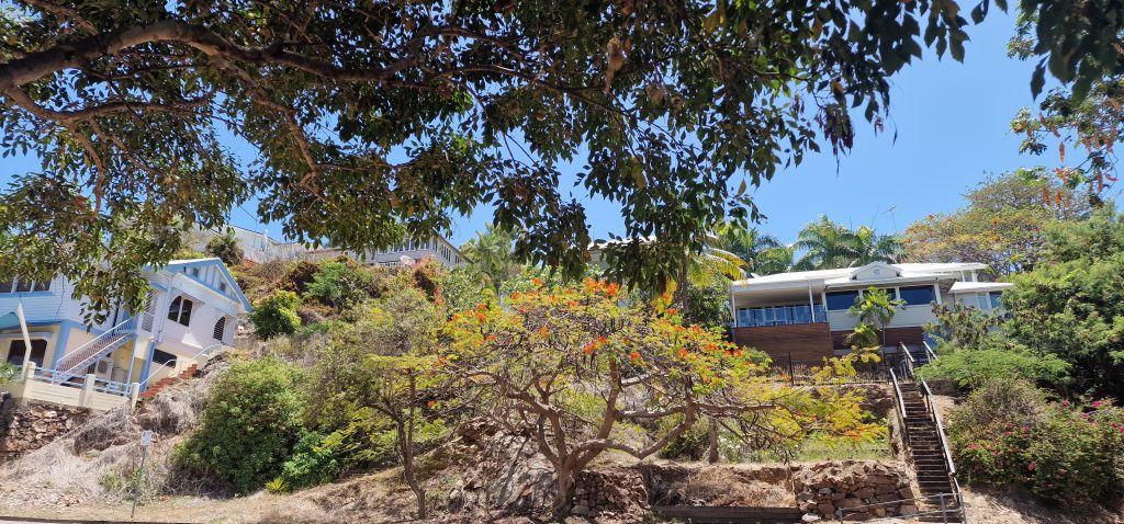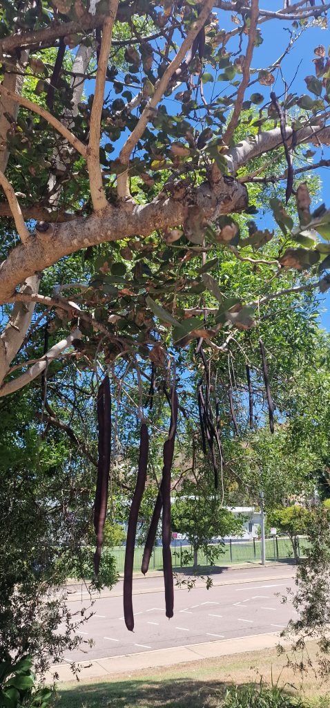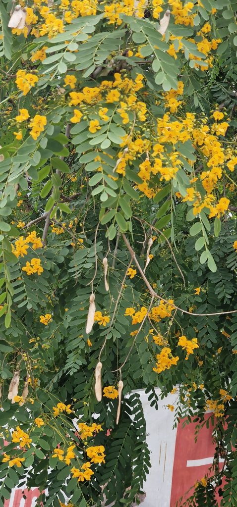 Vorletztes Bild die Röhren- Kassie, auch Indischer Goldregen, Blätter sehen aus wie der Robinie und Akazie, Blüten sind gelb wie bei der Akazie, aber die Röhren- Kassie bildet lange Bohnensamen, deren Inneres ich sah, wie Gellee, eßbar, mit Heilkräfte. Könnte sein, dass ich den in Miniatur als Rankpflanze am Zaun habe. Darunter wiedermal schöner blühender Flammenbaum in Townsville.