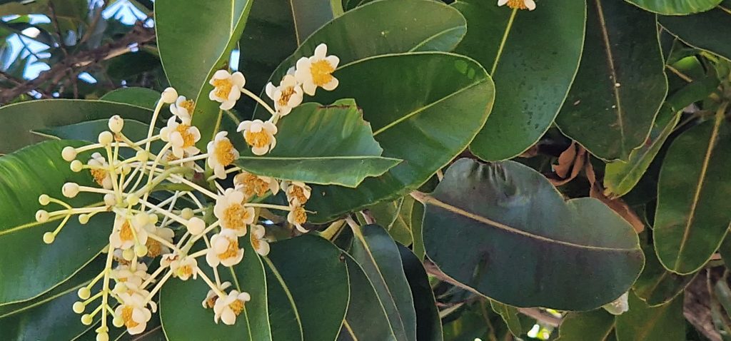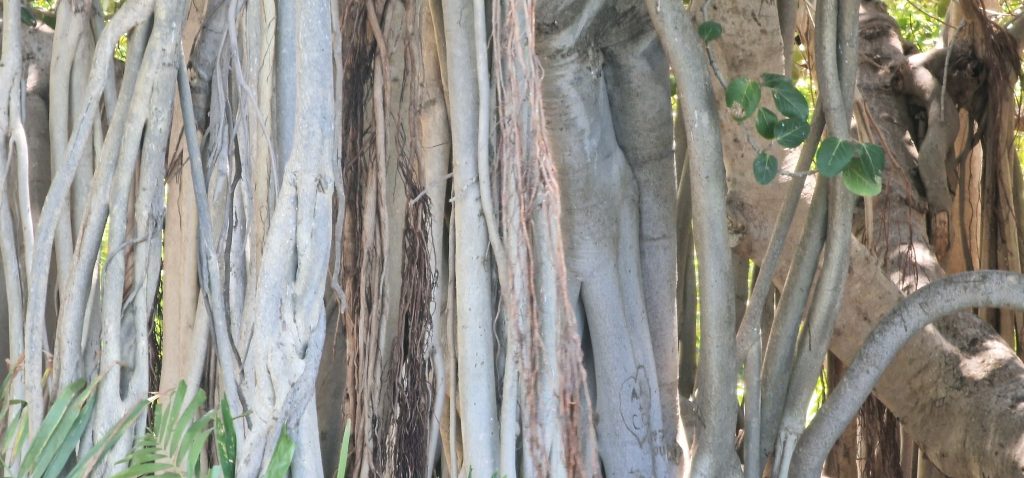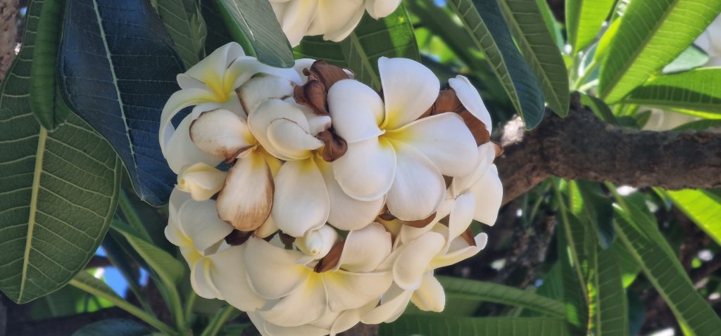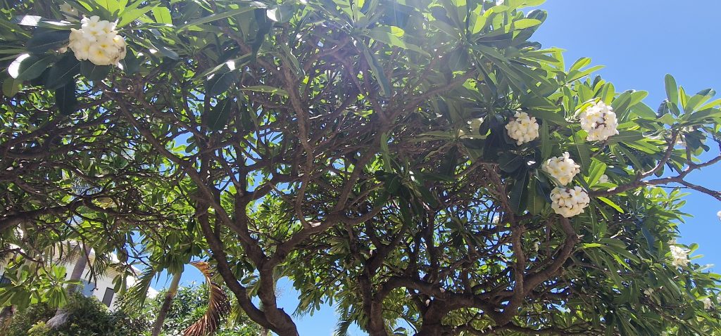 Fotos davor mit stark duftenden Blüten: Frangipani oder Westindischer Jasmin oder Tempelbaum. FOLGENDE: Indischer Banyanbaum- Indischer Nationalbaum, Ficus mit Luftwurzeln, folgt: