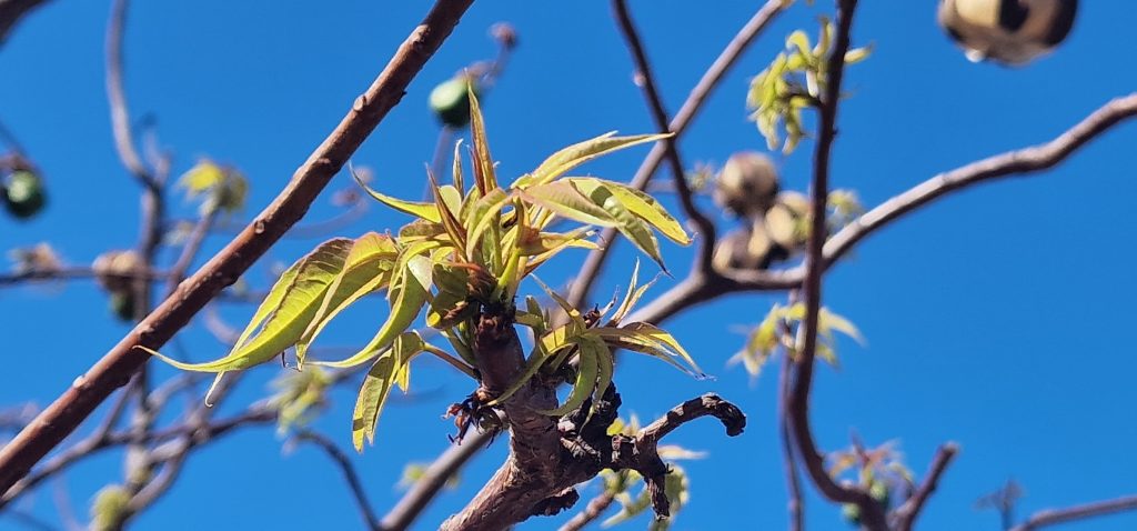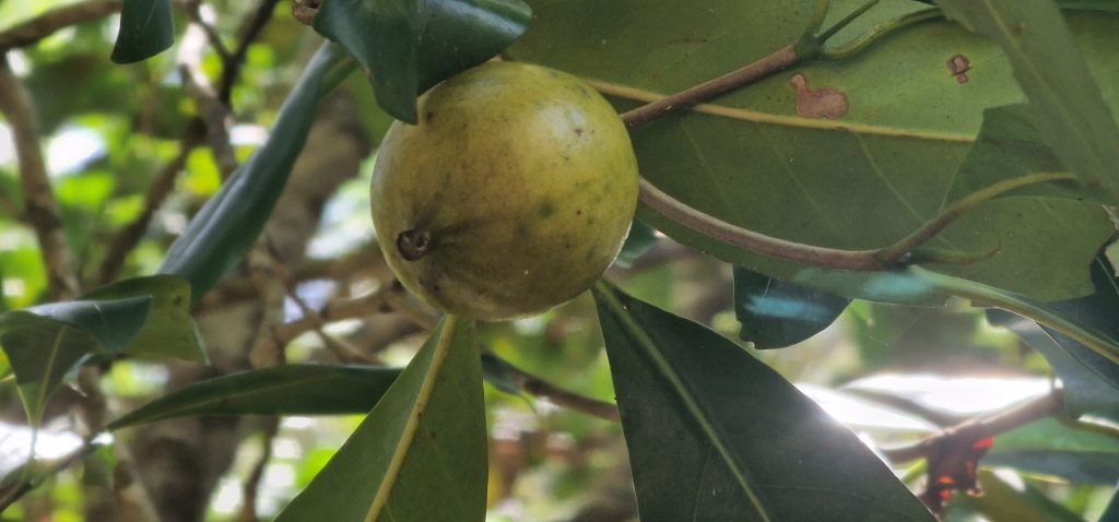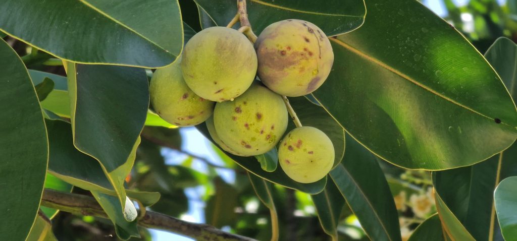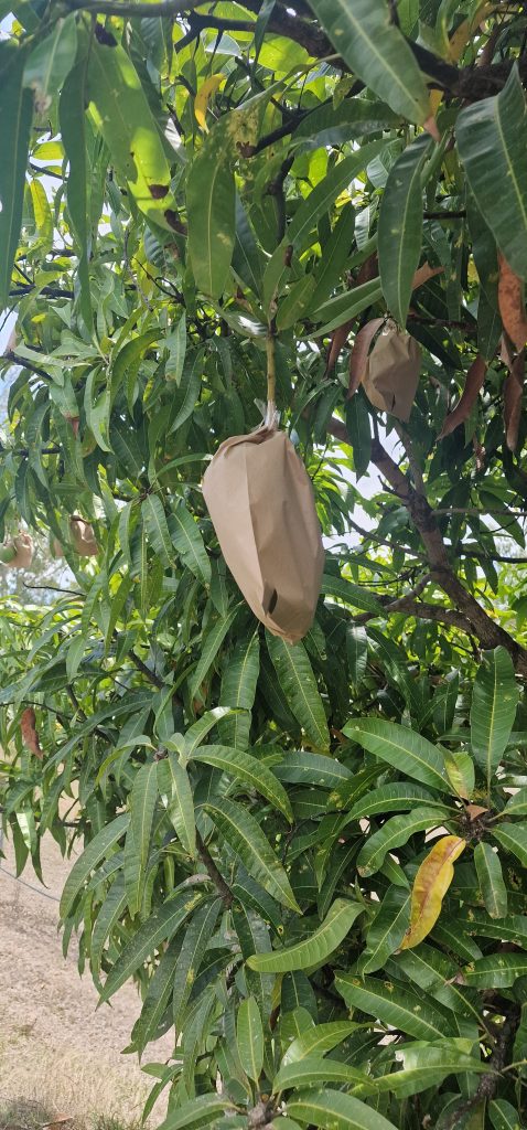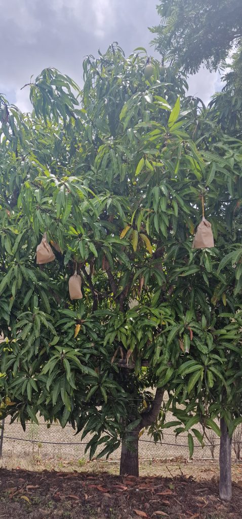 Ohne die Tüten, sicher zum Schutz vor Vögeln, hätte ich es nicht erkannt: Mangobaum