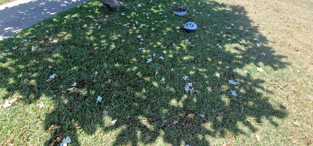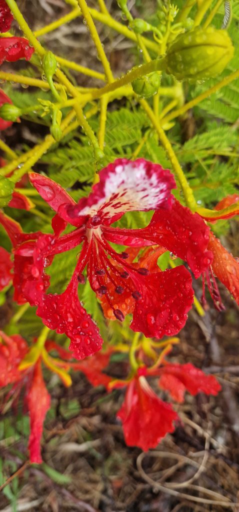 Der rot blühende, den wir oft sahen, hat auch Samenstände, lange Bohnen. Ist der Flammenbaum. Darunter die wunderschönen Blüten und die fein gefiederten Blättchen.