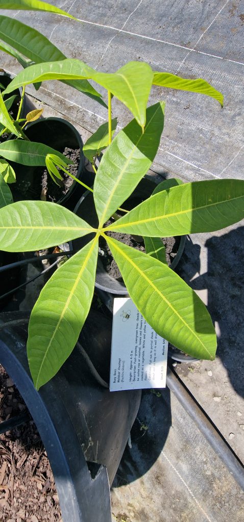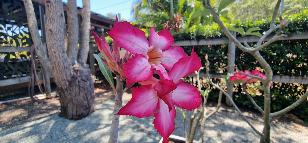 Lichtnussbaum in der Gärtnerei zu kaufen, und darunter Wüstenblume, auch in der Gärtnerei, in der Wüste sahen wir so große Blüten nicht