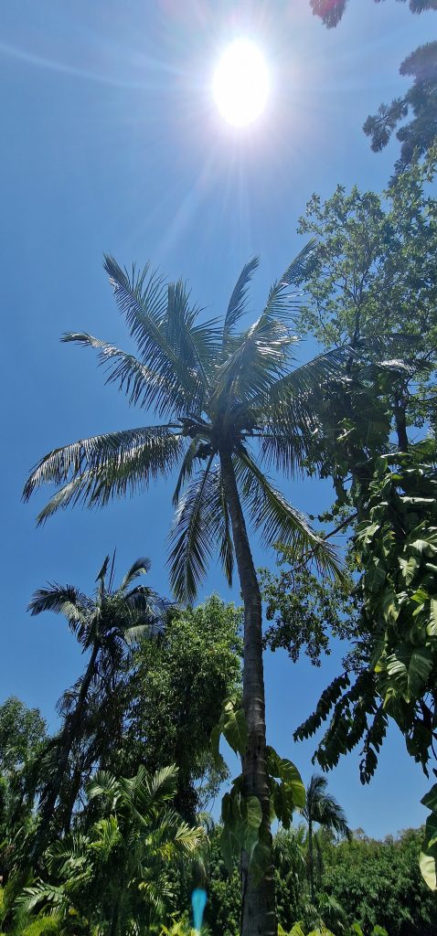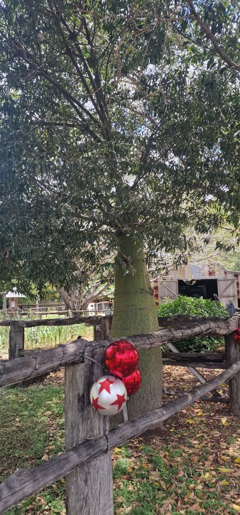 Hier sieht man die Flaschenform besser, samt Christmas- Schmuck mitten im Grünen und in der Hitze, für uns ungewöhnlich.