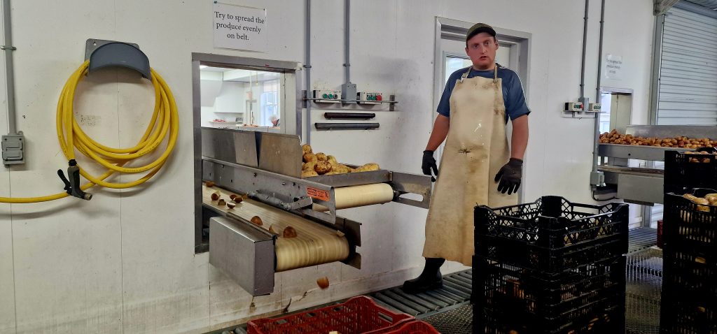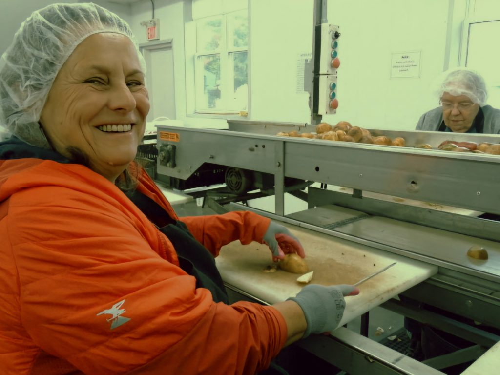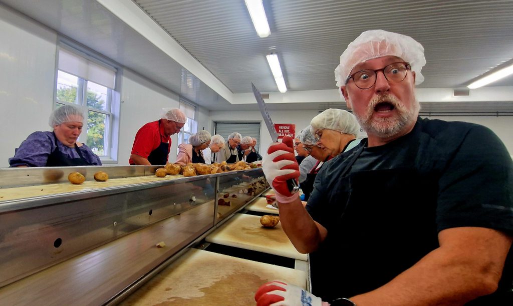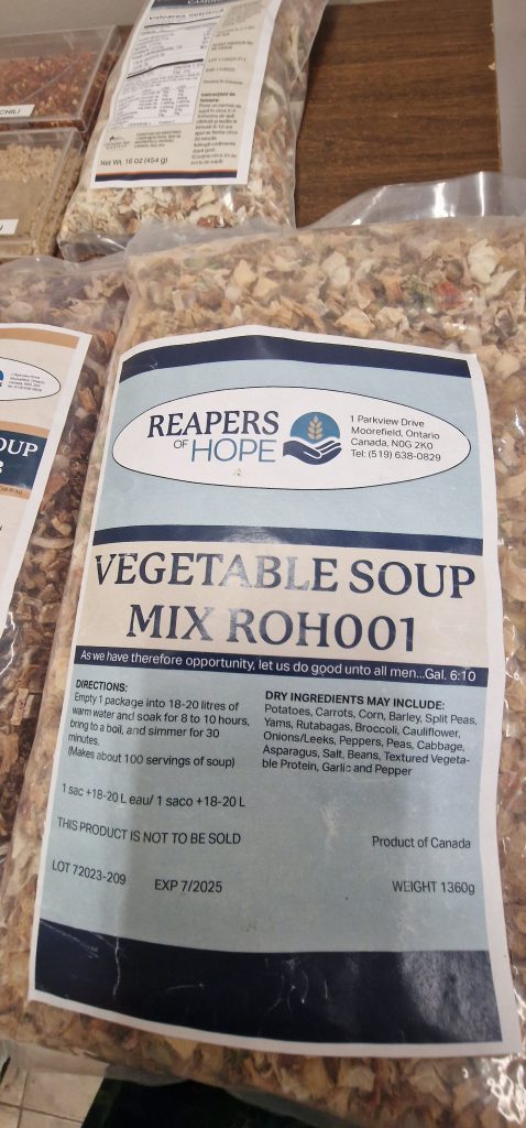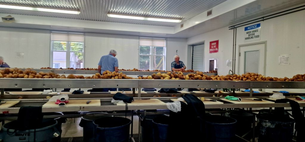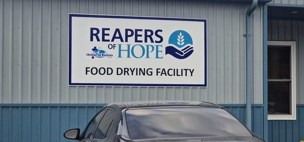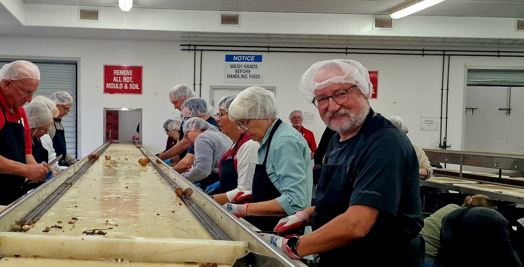 Schnitter der Hoffnung schnippeln Gemüse, was keiner verkaufen kann und deshalb von den Farmern ringsum in der Christlichen Mission kostenfrei abgegeben wird. Mennoitenfrauen und ältere Männer, Menschen mit welchem Glauben auch immer, Menschen mit und vielleicht welche ohne Beeinträchtigungen, Menschen mit verschiedensten Berufen, heute mal Zahnärzte, und Vereinsmeier wie Friendship Force Freunde stehen bzw. sitzen in der kalte Küche mit Schürze, Haube, Handschuhen und großem scharfen Messer. Auf dem Band oben rollen heute Kartoffeln an, auf das Band unten werfen die Schnitter für gut befundene, zurecht geschnittenen Stücke, in die Tonne kommt das Aussortierte. Wie wir später sehen, zerhäckselt eine große Maschine unsere Stücke in Stückchen und nach dem sie gewaschen sind wandern sie auf dem Fließband in einen großen Trockner. 8 Beschäftigte bezahlt die Mission, alles andere ist ehrenamtlich. Selbstverständlich. Ich kann mir nicht vorstellen, dass wir so viele Ehrenamtliche finden würden, die Kartoffeln bearbeiten. Die Trockenpeodukte gehen über Verteilerländer wie die USA und Deutschland in Projekte, wo Menschen Hilfe brauchen. Wo auch immer auf der Welt. Das weiß die Mission nicht immer.