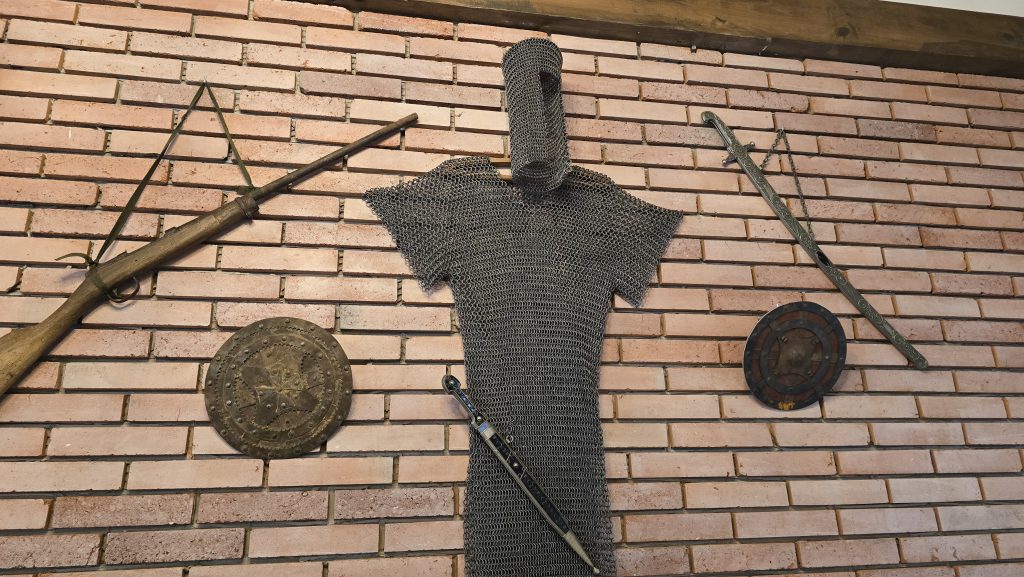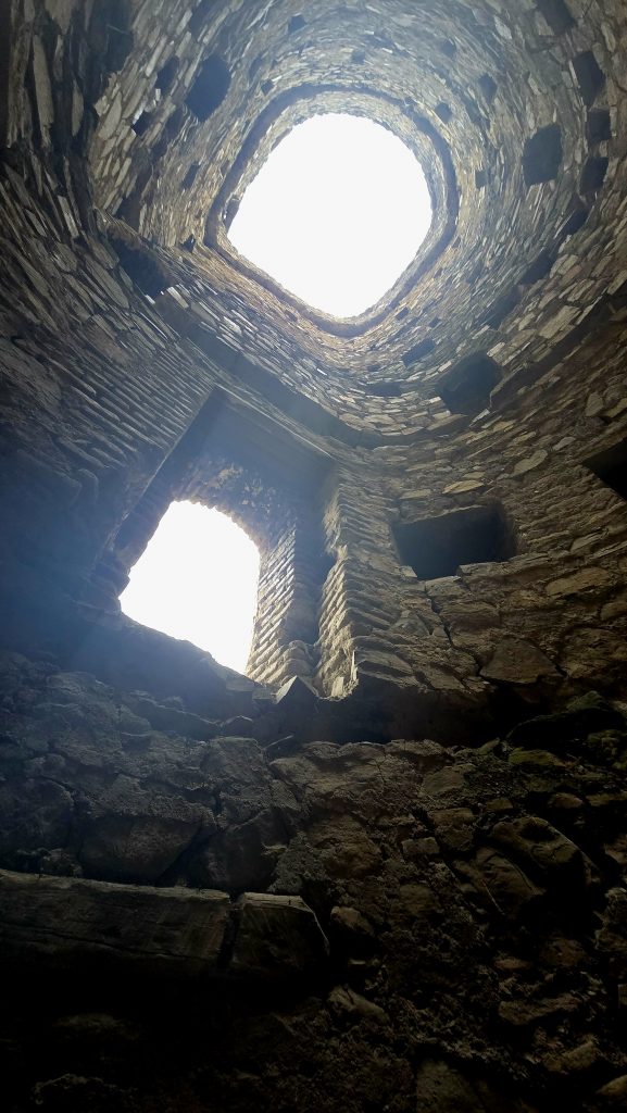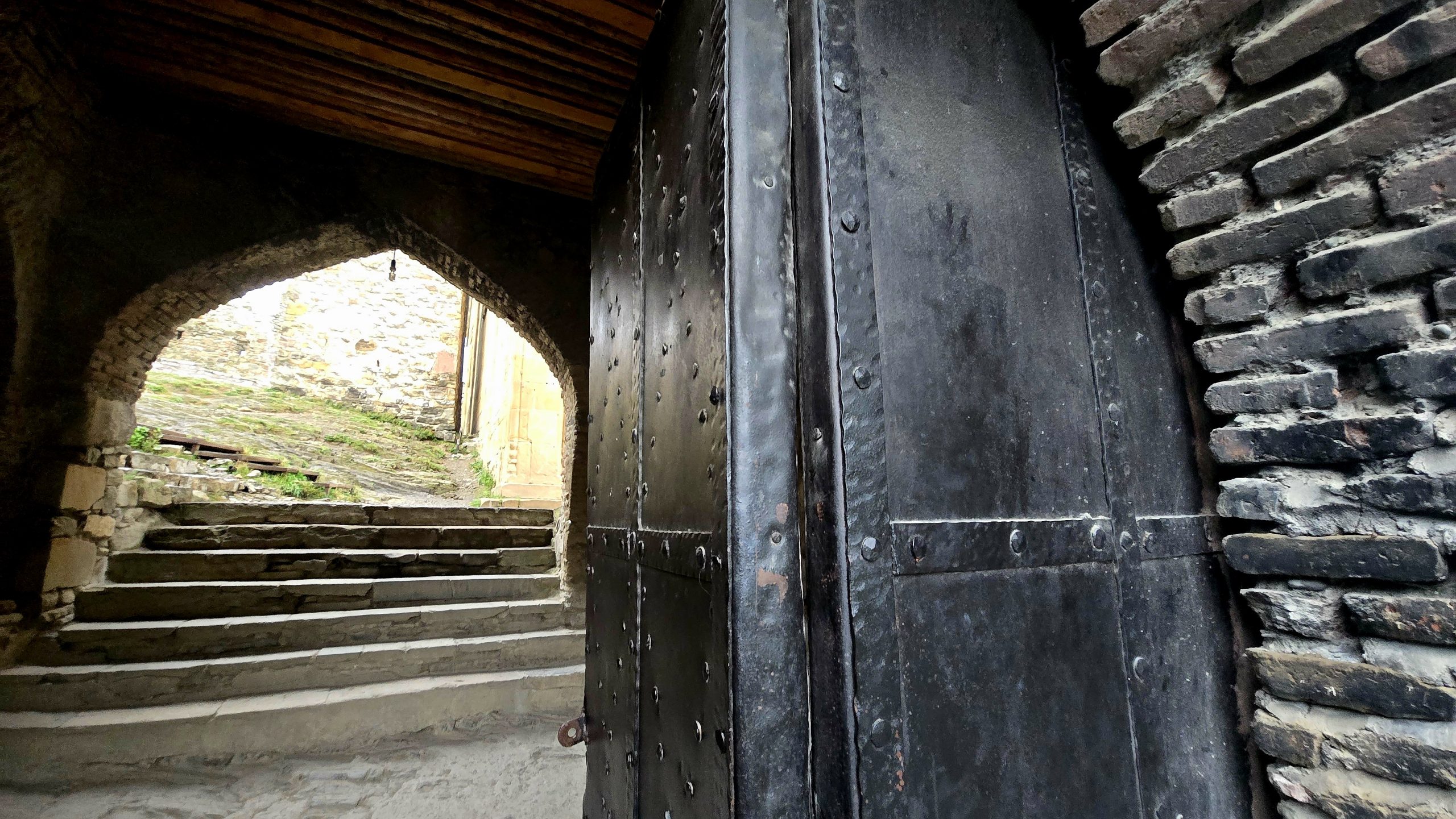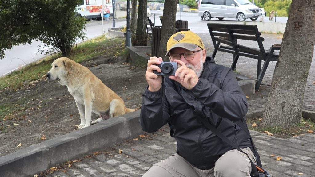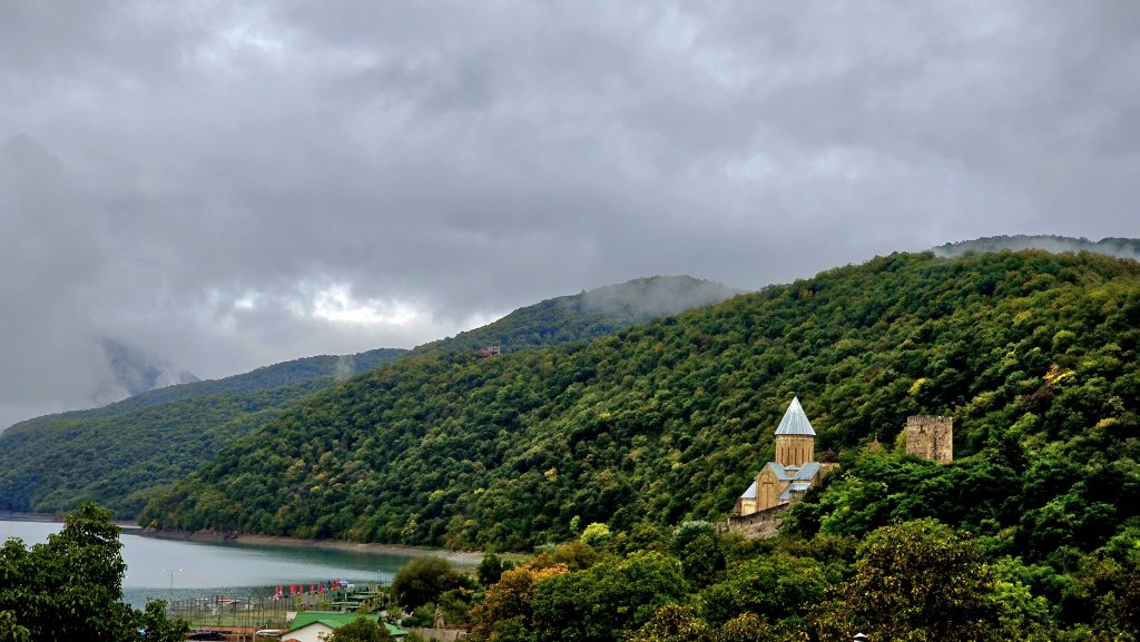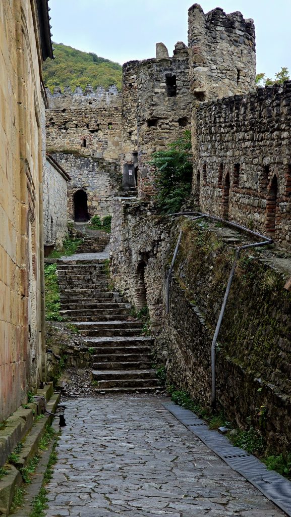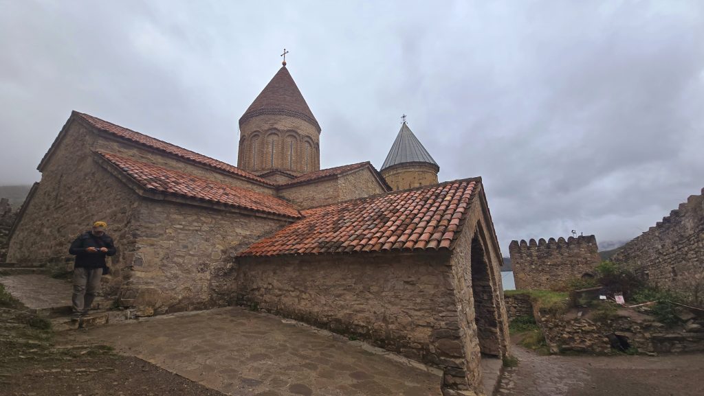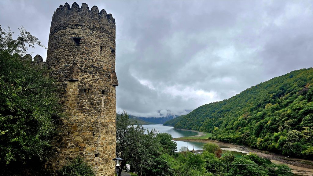 Unsere netten Gastgeberinnen servieren uns ein Frühstück, obwohl wir ausdrücklich nur Kaffee und Tee bestellten. Also frühstücken wir und ein Straßenhund freut sich über Reste von meinem Brot vom Vorvortag. Nicht weit von unserer Unterkunft entfernt liegt malerisch am Stausee Shinwali die Wehrkirche Ananuri und eine kleinere KIrche mit rundum Wehrturm-, Burg- und Klosterresten. Benannt sind der Ort und die Anlage nach dem Fürsten Ananuri, der, nachdem der persische Scha vertrieben wurde, regierte. Die Wehrkirche steht auf der Weltkulturerbeliste. Leider liegt auch etlicher Möbel- und Gerätemüll in den Gebäudewölbungen rum.