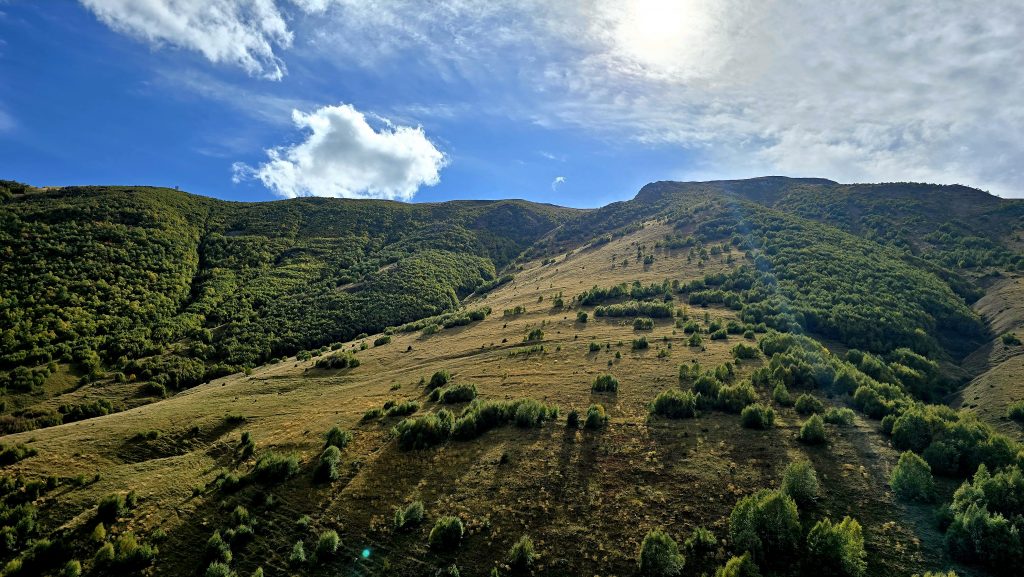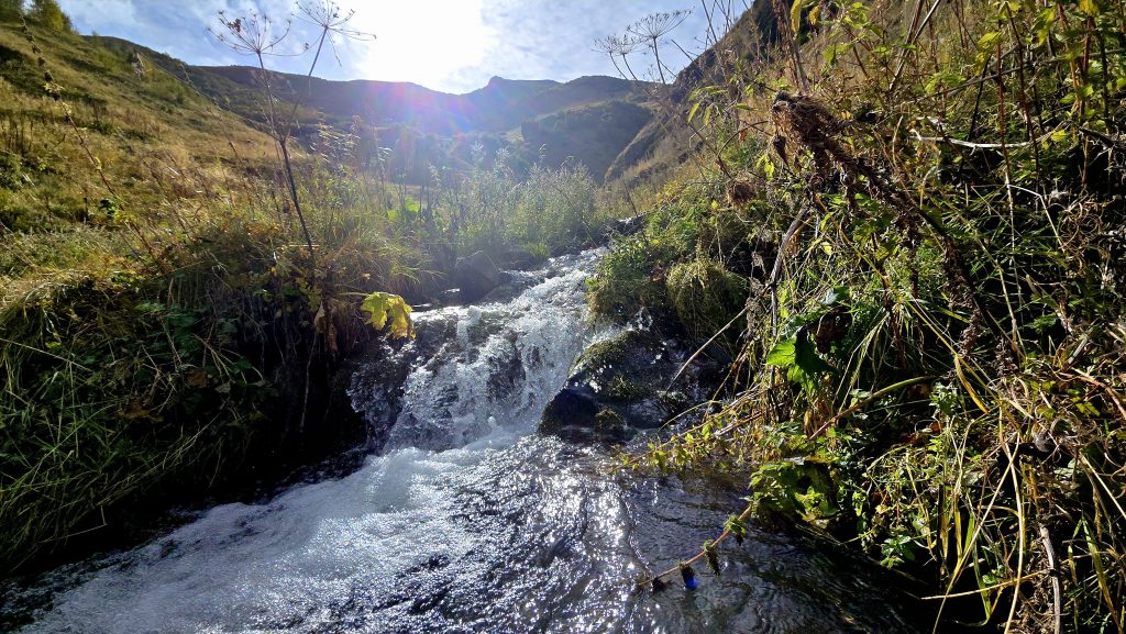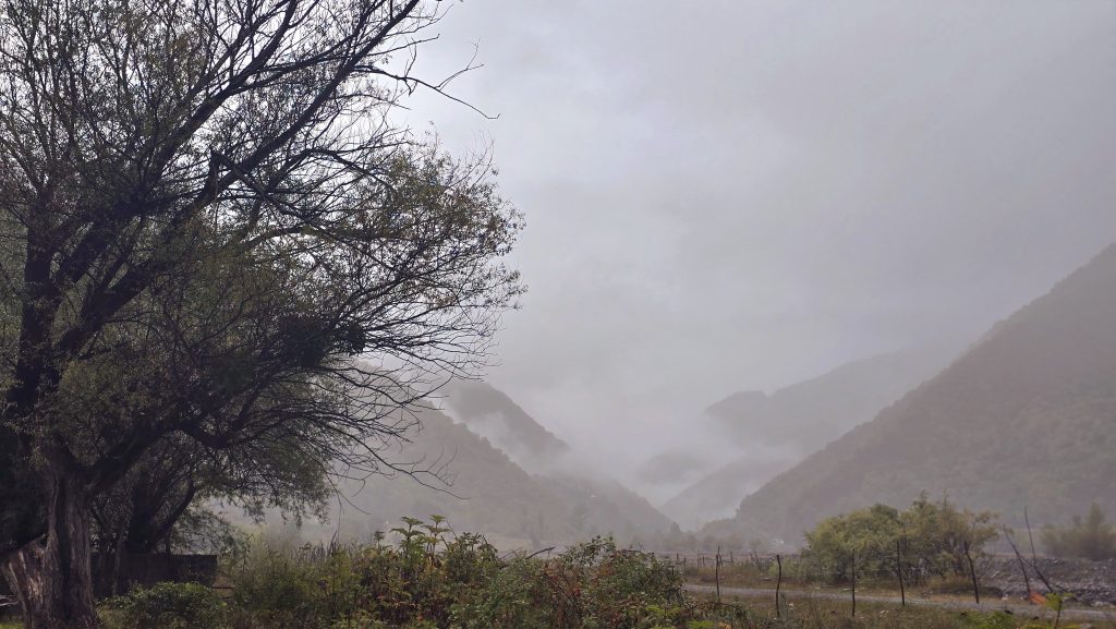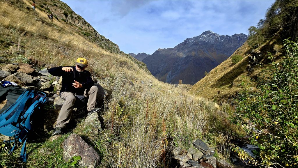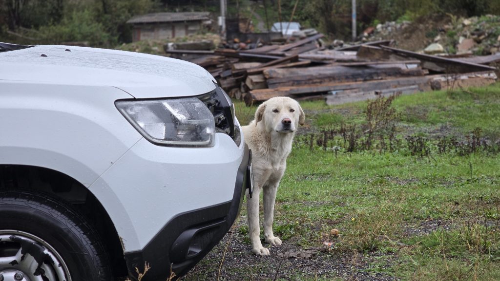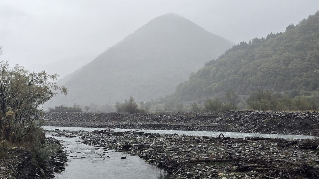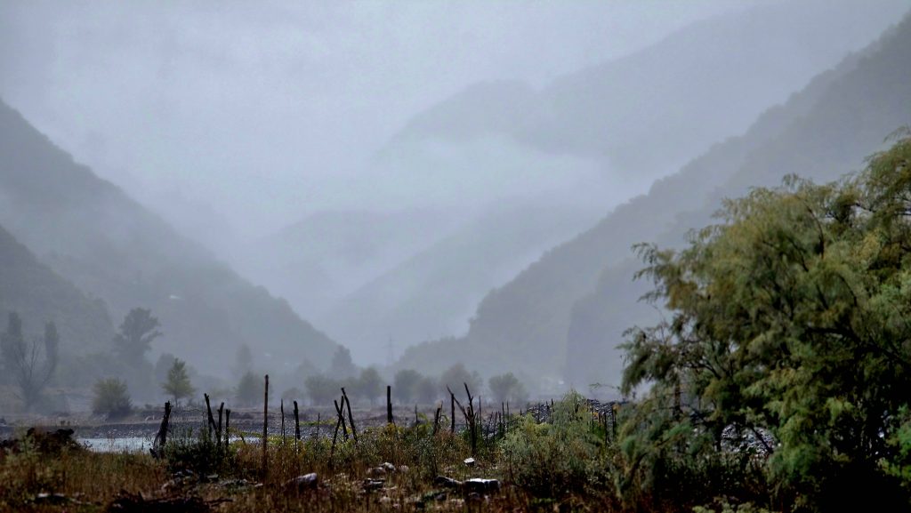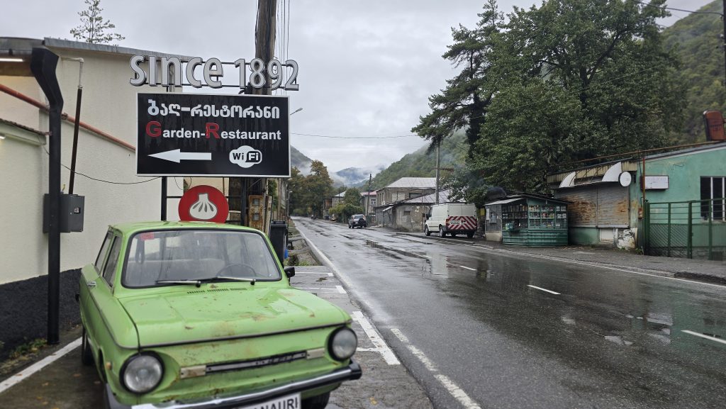 Weiter fahren wir im Regen auf der Georgischen Heeresstraße, die russische Soldaten errichteten und Georgien mit Russland verbindet. Vor Jahrtausenden zogen über diesen Weg Karawanen vom Kaukasus in den Orient. Jetzt überholen uns viele Fahrzeuge mit russischen Kennzeichen, sogar Laster drängeln und lassen wir vorbei. Wir wollen die spektakuläre Landschaft genießen. Aber auch im schönen Flusstal reihen sich verlassene Plätze von Sommercamps, Verkaufs- und sogar verfallenen Toilettenhäuschen aneinander.