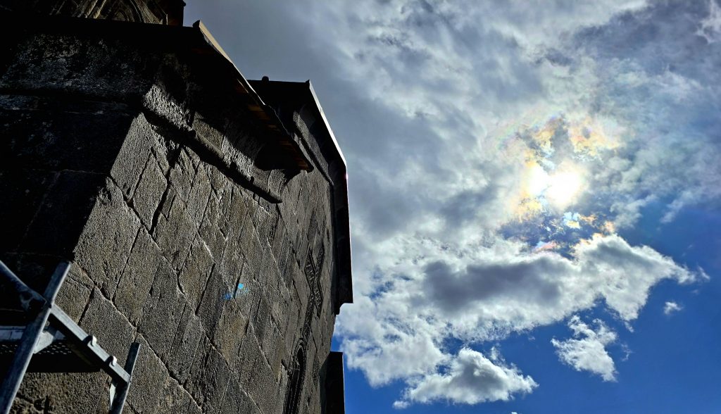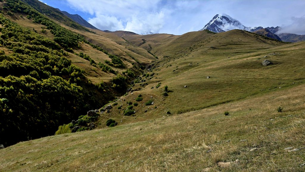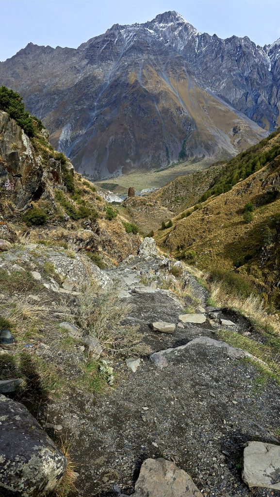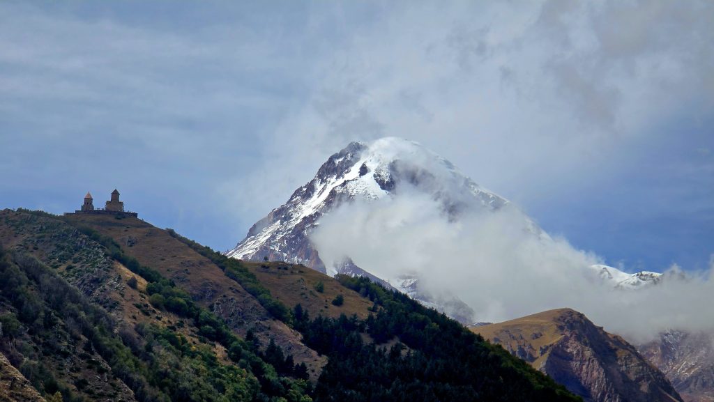 Dann treffen wir gleich unsere Freunde in Stepanzminda wieder, aber grade kommt die Sonne raus und wir springen froh darüber in ein soeben angemietetes Bustaxi, das uns zur Heiligen Dreifaltigkeitskirche auf dem Kwemi- Berg bringt. Dieser Berg liegt unter dem über 5000 Meter hohen Kazbegi.- Berg. Während sich auf dem Parkplatz vor dem berühmten Wallfahrtsort, um und in der kleine Kirche Menschen drängen, finden wir beim Abwärtswandern genug Ruhe und sind manchmal sogar allein auf weiter Flur. Auf dem Foto der Kazbegi rechts und links die Kirche: