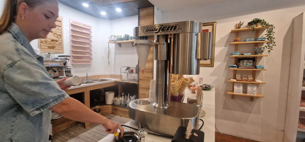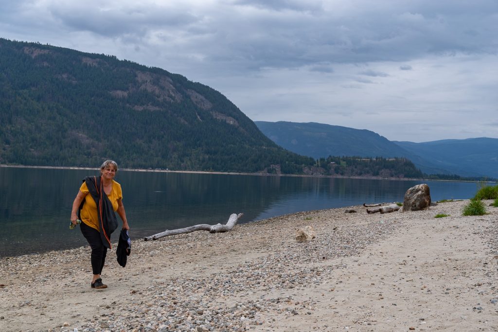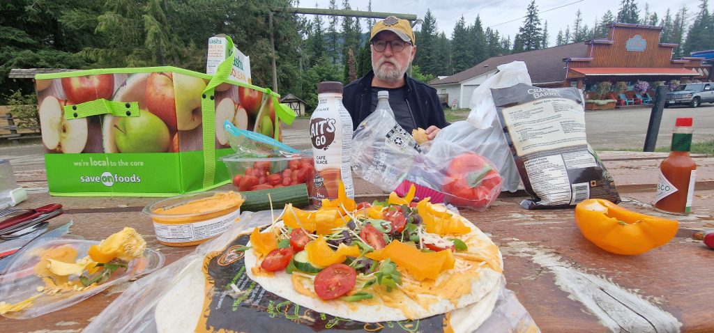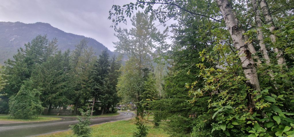 Wir erreichten auch den Parkeingang zum Revelstoke Nationalpark. Allerdings fährt man von da aus noch 26 km aufwärts, um mit der Wanderung zu starten.Das wäre heute wegen dem Regen und der Uhrzeit- es war schon Nachmittag- zu spät geworden. Also heißt es, bis morgen früh zu warten. Wir gönnten uns sehr leckeres Eis in Revelstoke. Es ist mit vielen großen Schoko- oder Kuchen- oder Toffee- oder… kandierten Kirschen durchzogen. Außerdem gab es in dem Laden eine Maschine, die das Eis und weitere gefrorene Früchte mixt und als Softeis rausbringt. Die Maschine sah ich schon mal in der Werkstatt Weimar, da war sie aber nicht so komfortabel. Die Früchte und das Eis werden durch Druck durch ein Sieb gepresst.