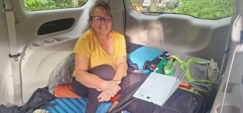 Nun regnet es sich ein. Aber wir sitzen (Reiner) bzw.liegen ( ich) gemütlich im Auto, nicht weit von Sitzbänken unterm Dach, Waschraum und Toiletten.