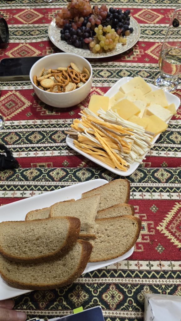 Abends essen wir zusammen mit allen Freunden von unserem Verein und drei Armeniern den armenischen Käse und Graubrot, das fast vom deutschen Supermarkt sein könnte. Der Verein von Jerewan befindet sich noch in der Gründungsphase, so dass wir nicht in Familien untergekommen sind, sondern alle im Gästehaus wohnen. Reiner und ich empfinden es als Luxus, in einem so großen sauberen Zimmer mehrere Tage uns häuslich nieder zu lassen. Es ist schön hier.