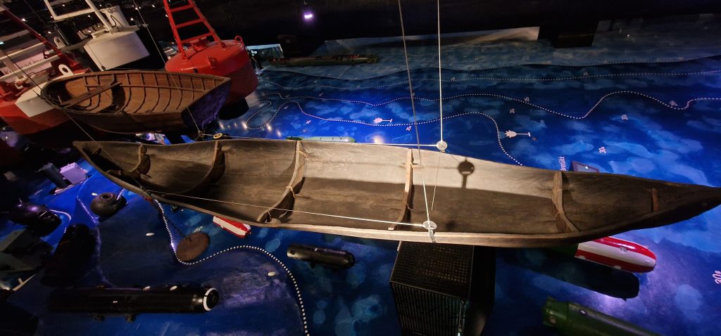 Gern wäre ich zu einen der sogenannten Lost Places mit dem Bus lange hin und zurück gefahren, um sehr schöne Fotos zu knipsen und den Platz zu genießen, vielleicht auch in dem klaren Tagebausee zu schwimmen. Der Ort befindet sich in dem Dorf Rummu. Aber die Enkelin wählte diesen Programmpunkt ab und entschied sich für das Meeresmuseum. Nach großem Eintrittsgeld von 30,00 € bestaunte ich die gigantische Halle, auf der schon die Klos in dunkelblauen Tiefen versinken. Sodann flanierten wir auf einer Hängebrücke an Segelbooten, Eissegelbooten (? heißen die so?), Holzkanus, Unterseebooten, Schiffchen und Bojen oder was auch immer aus der nautischen Welt vorbei. Jedes Mal gab es dazu einen Menschen auf dem Bildschirm, der auch in englisch erzählte. Fotos und Filmchen erleichterten das Verstehen. Auch das Segeln mit einem der ersten Segelflugzeuge simulierten wir und warfen kleine Papierkegel in den Wind, die darin tanzten. Ich lernte, dass dieses Museum schon vor dem zweiten Weltkrieg bestand und irgendwann vor paar Jahren sehr aufwendig saniert wurde. Ich freute mich, wieder ans Tageslicht zu kommen.