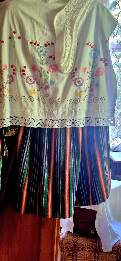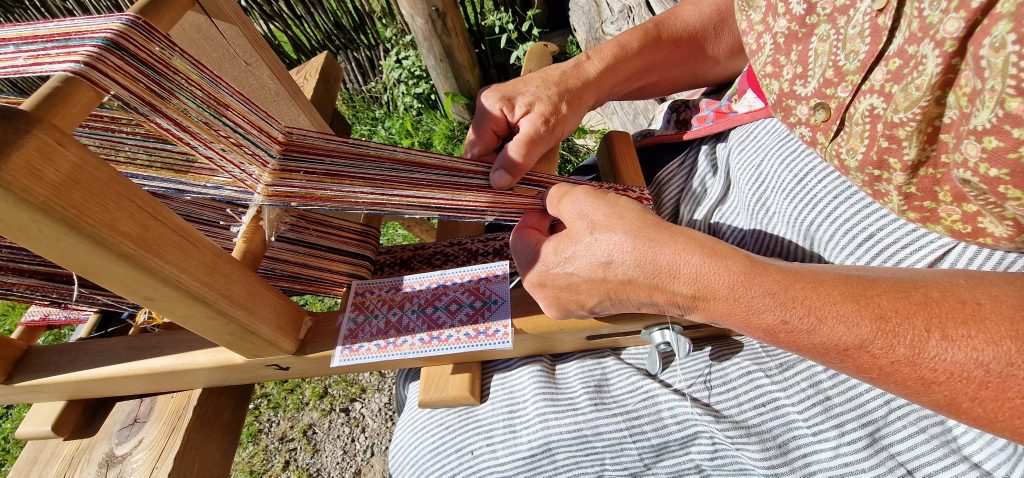 Weben der Bordüre und Kutschfahrt mit Pferd und Spitz und Tracht