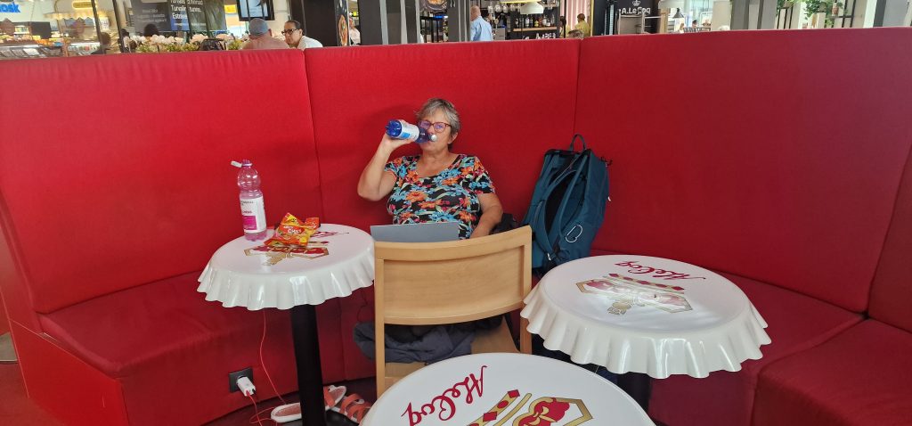 Noch ein Besuch im Rahthaus, dem ältesten in Nordeuropa, und ein Blick hinaus..Noch eine Mönchsuppe mit Steinpilzen und ein estnisches Roggen- Brot mit Preiselbeeren und Malz. Und dann nur noch warten, zuerst auf das Taxi zum Flughafen. Dann im Flughafen auf den Abflug. Der Flughafen Tallinn ist sehr modern, sehr sauber und sehr gemütlich. Wir sitzen in Chillecken am richtigen Flughafengate mit Stromanschluss. Da unsere Akkus ständig runter sind, ist der Stromzugang wichtig.