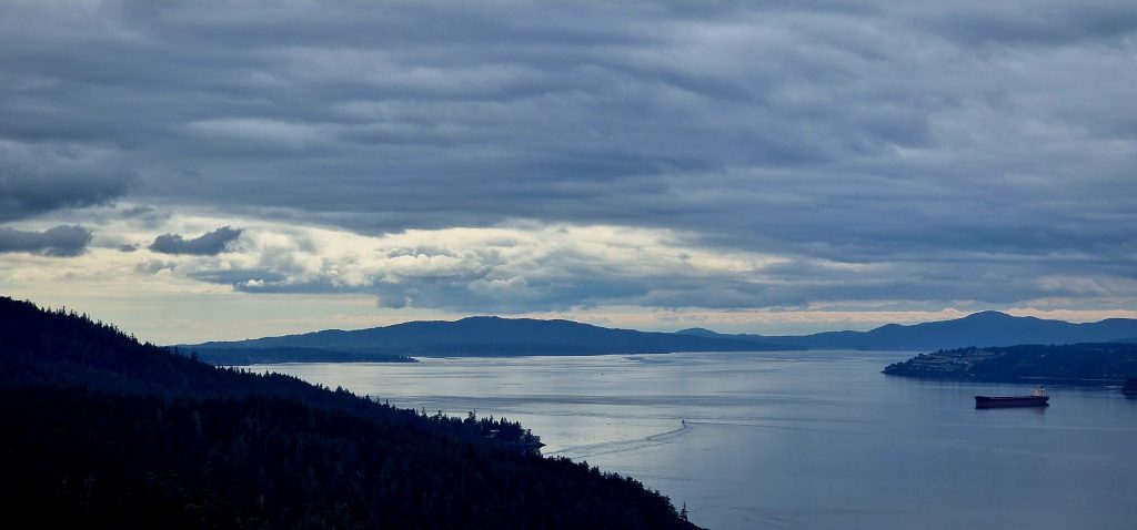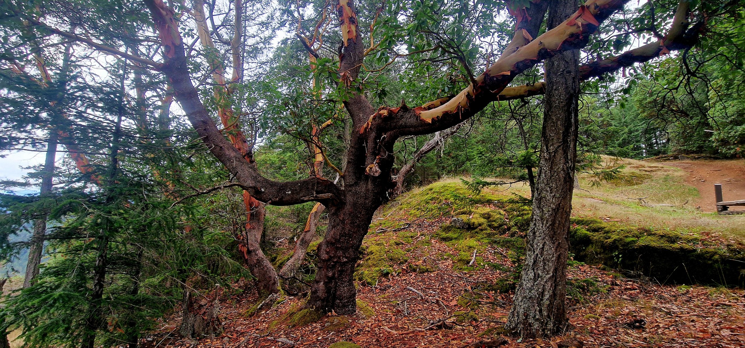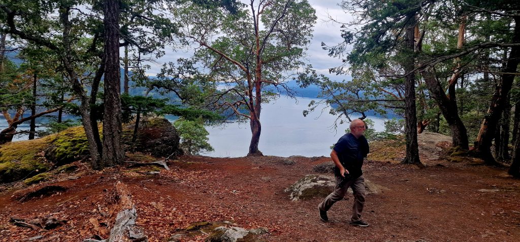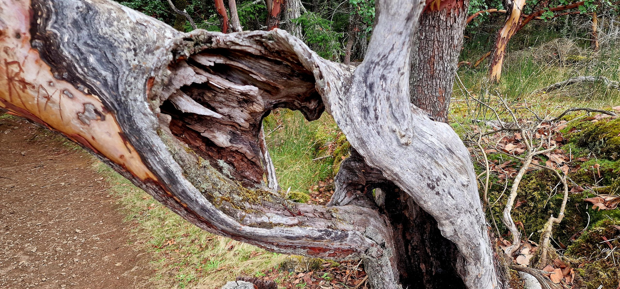 Von dem Campground am Meer in Richtung der Norden der Insel fuhren wir wieder zurück, in Richtung Süden, bis zur Stadt Nanaimo. Dort soll es die berühmten Nanaimo Bars geben. Wir suchten und fanden eine Café mit diesen und probierten das sehr süße Gebäck. So gestärkt fuhren wir weiter in den Süden zu einem Wandertrail. Auf der kleinen Wanderung (6 km Rundweg mit etwas bergauf und bergab) genossen wir die Ruhe im Wald, seine Andersartigkeit und natürlich die spektakulären Ausblicke auf den Pazifik. Wir fotografierten viel und weil Flora inkognita selbst im Wald ins Worldwideweb fand, bestimmte ich einige Pflanzen. So fand ich heraus, dass die Red Cedar, die Rote Zedar hier genannt, ein sehr großer Lebensbaum ist, der hier in Nordamerika heimisch ist. Auf dessen Holz war am Abend zuvor der Fisch so köstlich gegrillt worden! Weiterhin lernte ich, dass der vermeintliche Ficus der Amerikanische Erdbeerbaum ist. Er hat eine sehr interessante Rinde, die sich schält. Auf den Bäumen die Flechten, die ich schon oft sah, ist das Louisanamoos. Der Wald war zugewachsen mit Moosen, Farnen, Mahonien und Beeren namens Shallon, die ich bisher noch nicht kannte. Alte Orgeoneichen, Ahorne, Lärche, Fichten, Tannen und Kiefern wachsen hoch in den Himmel.