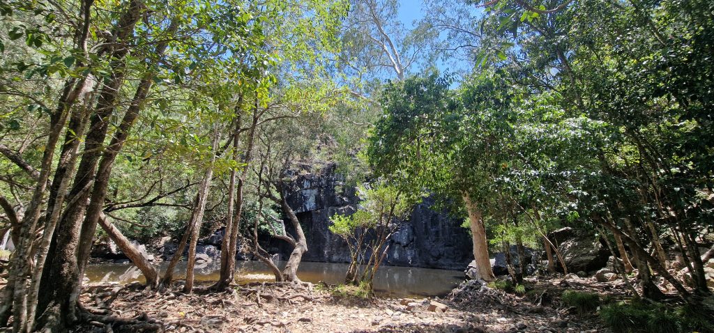 Heute fuhren wir an den Wasserfall Cedar Creek in den Bergen, der sich in einem See ergießt, in dem man herrlich Krokodil- und Quallen-frei schwimmen könnte So sieht das auf dem Prospekt aus. Aber das muss zur Regenzeit sein. Heute stürzte kein Wasserfall in das trübe Seechen. Nur die Sonne brannte unbarmherzig drauf. Eine Reisegruppe kam mit Proviant und Schwimmnudeln und war ebenso enttäuscht.