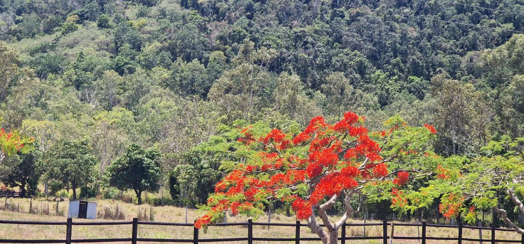 Der Baum mit den roten Blüten ist der Flammenbaum,blüht jetzt hier überall wunderschön. Die Früchte, die ich fotografierte und wie Äpfelchen aussehen, sind vom Gelben Oleander am Bergsee.
