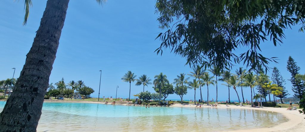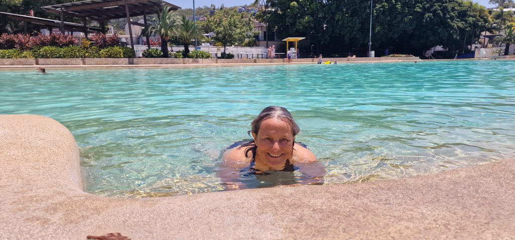 Nach der Wanderung suchten wir Erfrischung. In Airli Beach besuchten wir wiedermal völlig kostenfreies Schwimmbad am Ozean. Auf der einen Seite liegt verlockend türkis das Meer. Auf der anderen Seite schwammen wir zu zweit im sehr großen Pool.