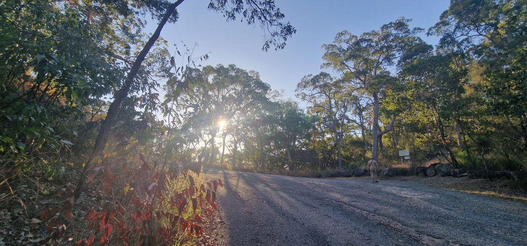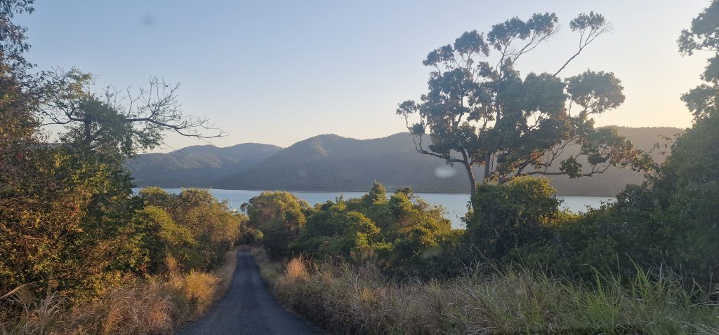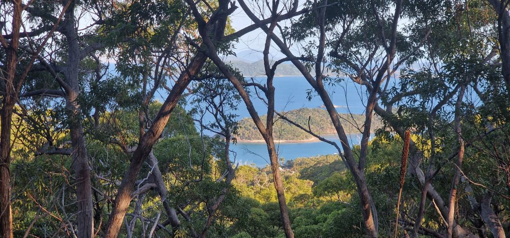 Nachmittags wandern wir ächzend auf den Mont Rooper im Nationalpark Conway Range. Die lautmalerischen Aussichten auf die Whitsynday Inseln und der fremde Wald mit Grassbäumen faszinieren uns ebenso wie die Stille, nur Grillen zirpen, unbekannte Vögel rufen. EInmal kommt ein Mountainbiker vorbei, den wir nett grüßen und bewundern, er fragt, ob wir Deutsche sind. Dann brettert er den Berg runter und wir haben die Stille des tropischen Waldes wieder für uns.
