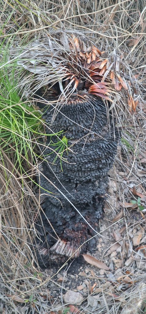Dieser Grasbaum überstand einen Buschbrand. An den kleinen Gräsern, die wieder wachsen, kann man ablesen, wie lange das Feuer her ist. Jedes Jahr ein Zentimeter.Vielleixht 5, 6 Jahre?