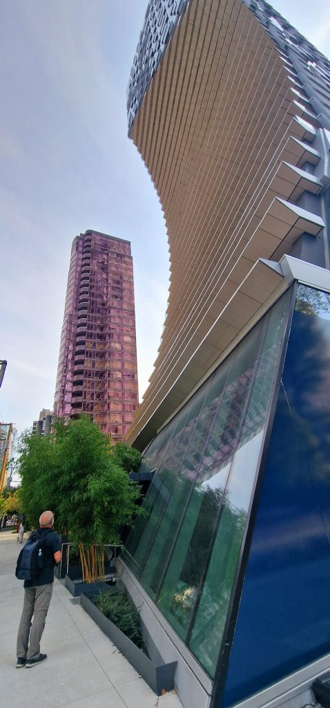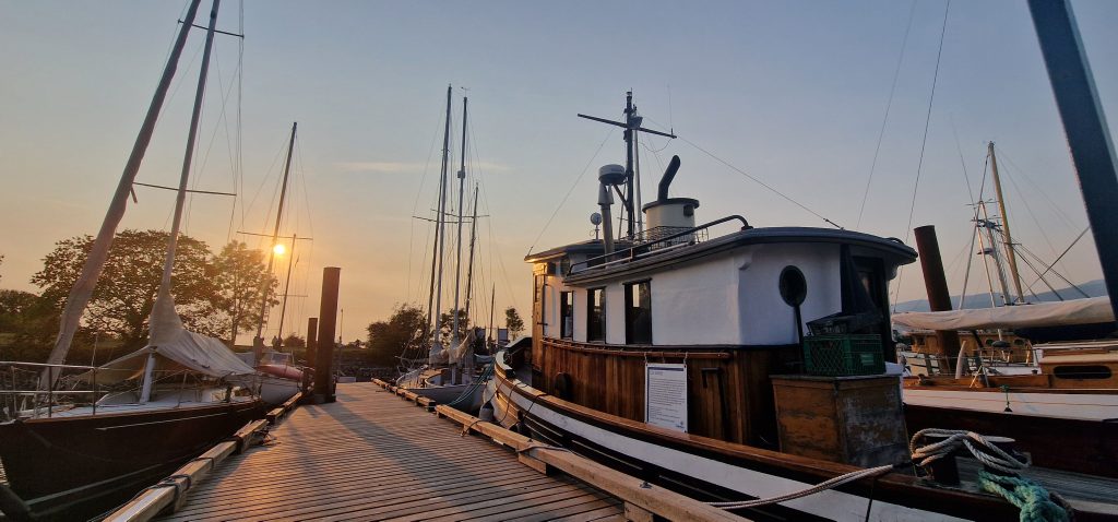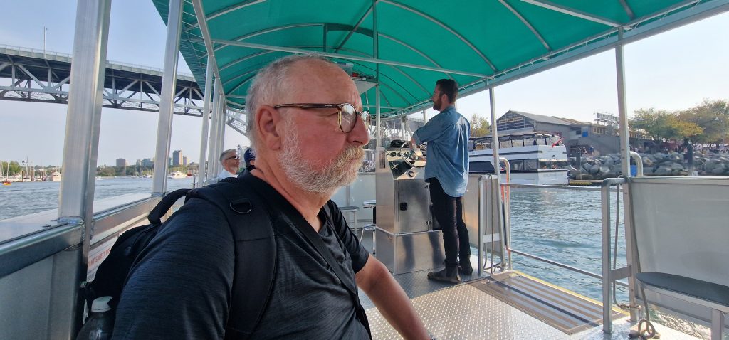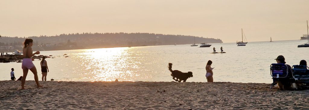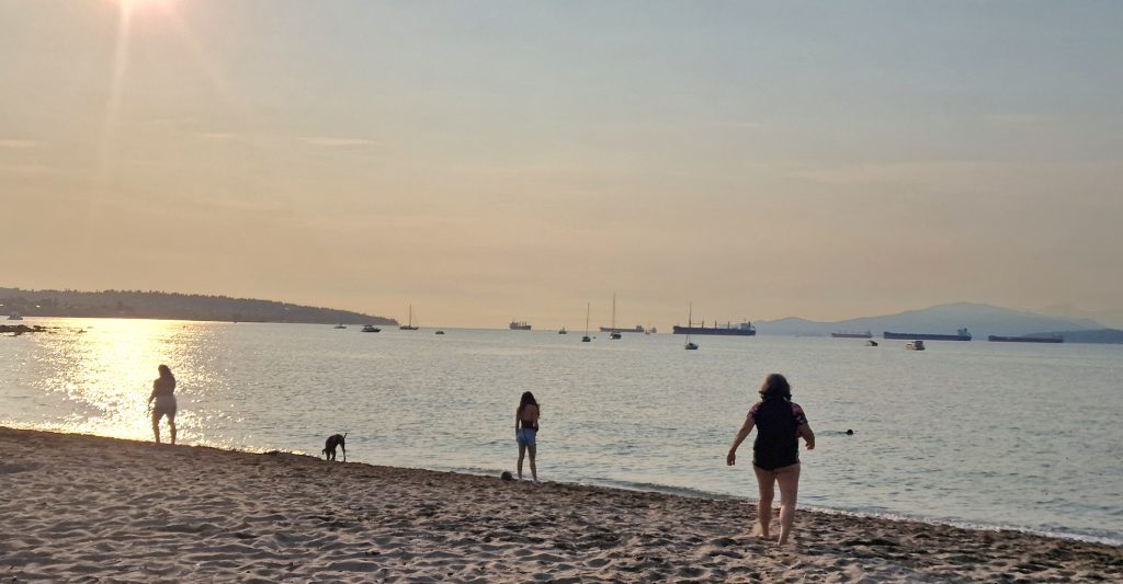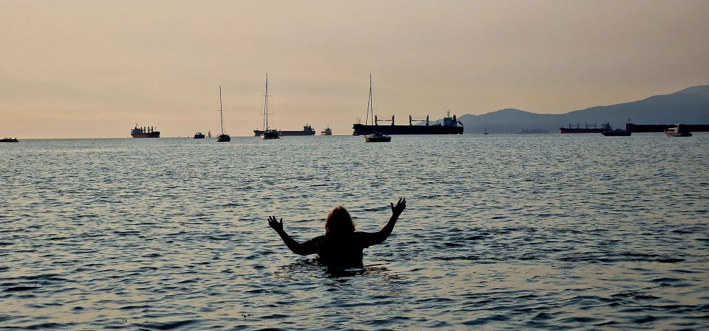 Wir laufen von der Halbinsel mit dem Stanley Park durch Downtown. Rechts und links die Häuser hoch, in der Mitte ein nicht endendender Fahrzeugstrom mit Autos und Fahrrädern und Rollern, durchschnitten von dem grellen Sirenen des Krankenwagens. Das macht fußlahm. Vancouver beherbergt viele Süchtge, die auf der Straße in verkrümmten Haltungen wie tote Denkmale liegen. Wir schaffen es, auch ihnen vorbei, bis zur Fähre, die rüber fährt zu Granville Island. Hier herrscht buntes Markttreiben und ich könnte stundenlang zuschauen, wie Crêpes, Bagel und Burger belegt werden und beobachten, was brummt, was nur vor sich hindümpelt, wo der Dampfgarer Hochjunktur hat usw. Wir essen Eis und trinken Kaffee. Mit der nächsten Fähre geht’s weiter raus zum Kitsilano Beach, wo ich nochmal glückselig schwimme und untertauche, bis Qualle eins Guten Tag sagt, dann Qualle zwei und dann sage ich Auf Wiedersehen, schönes kaltes Naß.