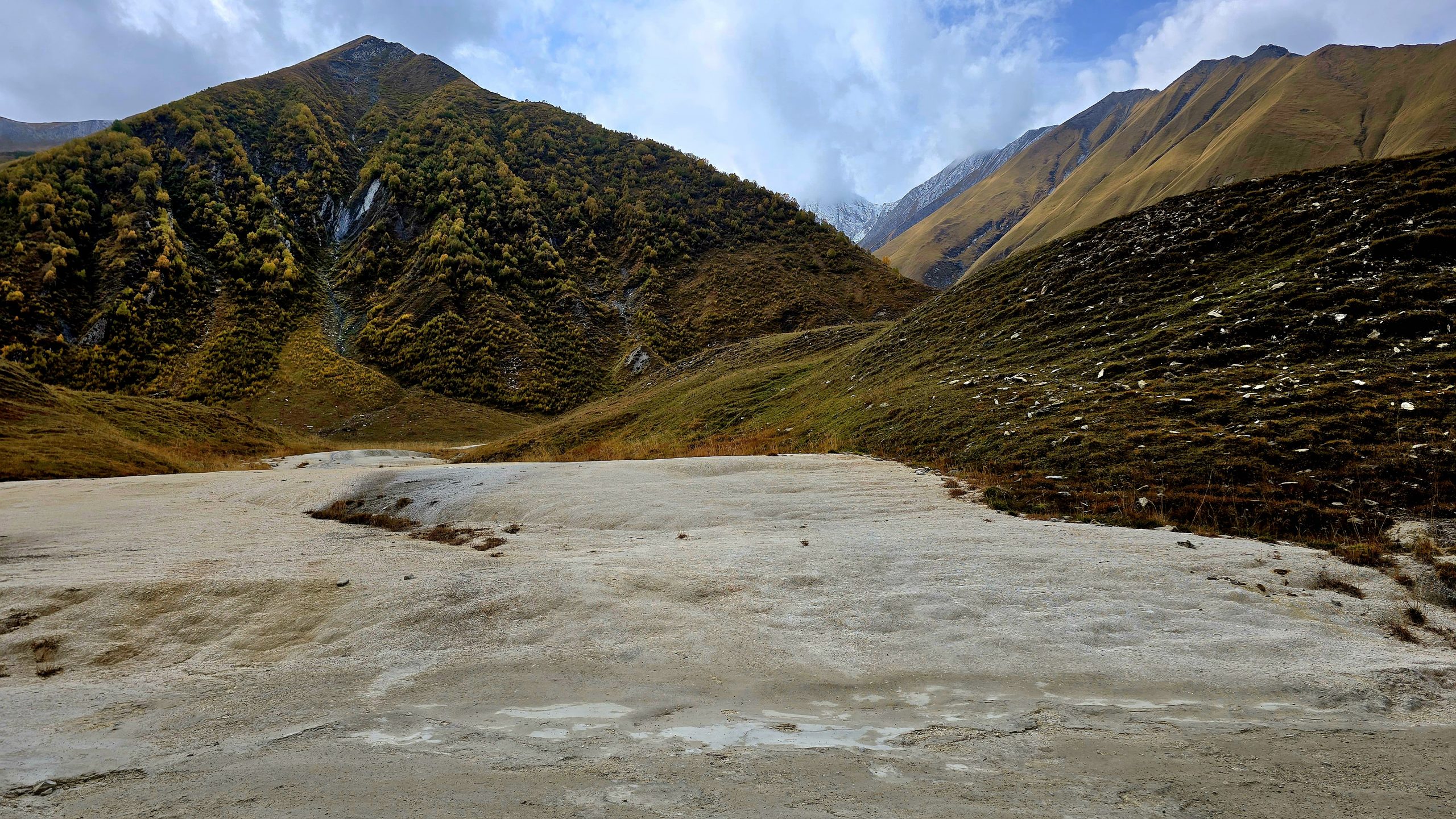 Auch später, beim Weiterwandern, entdecken wir kleine Wasserbecken, in denen Bläschen aufsteigen. Dazu gesellt sich das fantastische Panorama. Steine in verschiedenen Farben leuchten unter den sich herbstlich färbenden Birken. Zwei Adler umkreisen hoch über uns ihre Beute. Sonst hören wir kaum Vögel oder sehen andere Tiere. In dem Dörfchen Kurtasi, dass im weiteren Verlauf folgt und sehr verlassen wirkt, halten die Bauern Schafe und Kühe. Soweit ich es verstand, lebten in dem Dorf Osseten, die das Dorf nach den Auseinandersetzungen zwischen Georgiern und Osseten verließen. Jedenfalls liegt gleich westlich neben dem Gebiet, auf dem wir im Lande Georgien wandern, das autonome Gebiet Süd- Ossetien. Die Osseten möchten zu Russland gehören ebenso wie die Abchasier weiter westlich in ihrem autonomen Gebiet. Diese autonomen Gebiete umfassen, wie ich lese, 20% der Fläche von Georgien. Ich glaube, dass auf den Pferden Osseten reiten. In dem Dorf Kurtasi sehen wir von weitem frisch gedeckte Dächer eines der Klöster, die im Tal liegen. Wir kehren um und laufen auf der Schotterpiste zurück.
