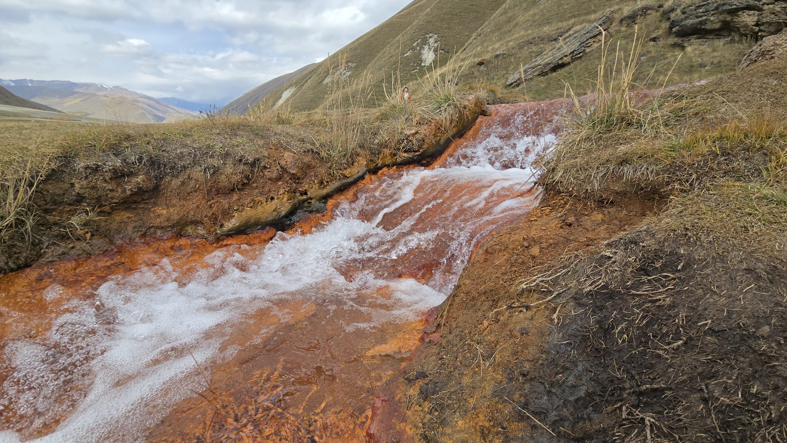 Drei Busse mit asiatischen Touristen kommen an und die Gruppe nimmt den gleichen weiteren Weg wie wir. Bei dem Weg handelt sich um das „Filetstück“ vom Truso- Tal. Wir gelangen mit der Gruppe aufwärts steigend-eine Dame muss geschoben werden, aber alle verhalten sich kameradschaftlich- und einigen weiteren hundert Metern auf einem schmalen Pfad am Hang an den Albano Lake. Wenn es Magie gibt, dann hier. Aus dem kleinen, blau schimmernden See steigen Luftblasen auf. Das Wasser der Mineralquelle fließt abwärts in rostbraunen Bächen zum Fluss Terek.