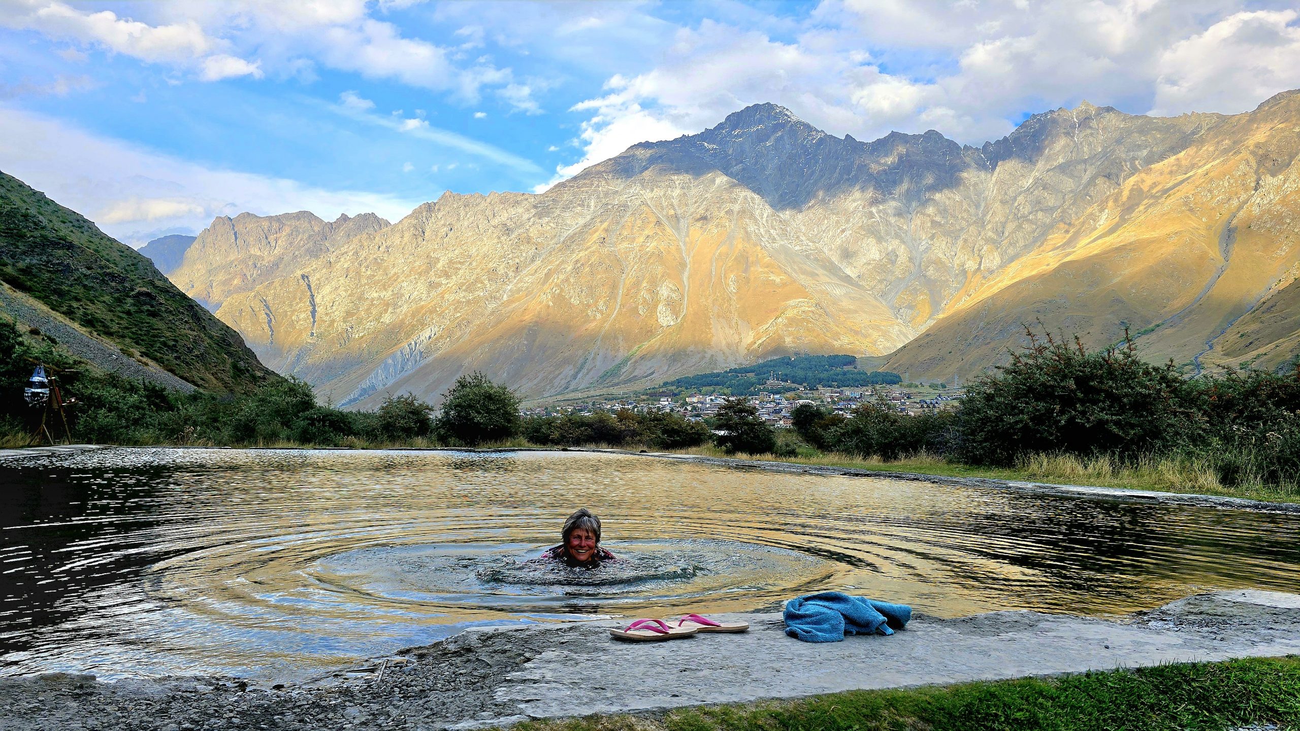 Angekommen an unserem Auto träume ich vom heißen Bad in Swimmingpool Stepanmindza. Deshalb fahren wir dahin zurück und wieder über eine Schotterpiste zum Pool. Ich erschrecke, keine warme Quelle vorzufinden, sondern einen Pool mit umgeleiteten eisigen Wasser vom Fluss. Das wäre hier ein schöner Sauna- Standort. Ich gehe trotzdem mutig kurz in den Pool, schon wegen dem tollen Foto mit Bergkulisse.