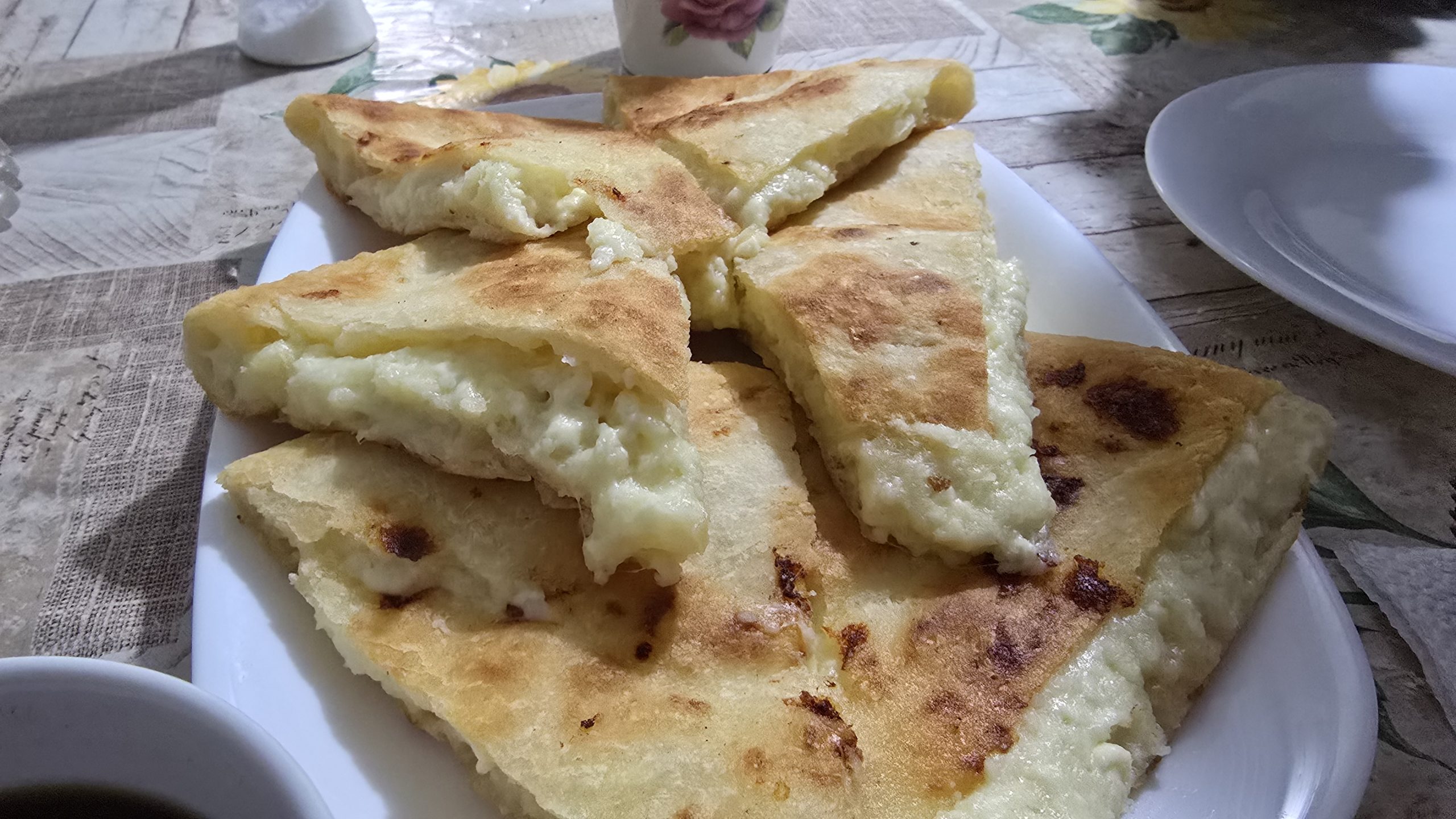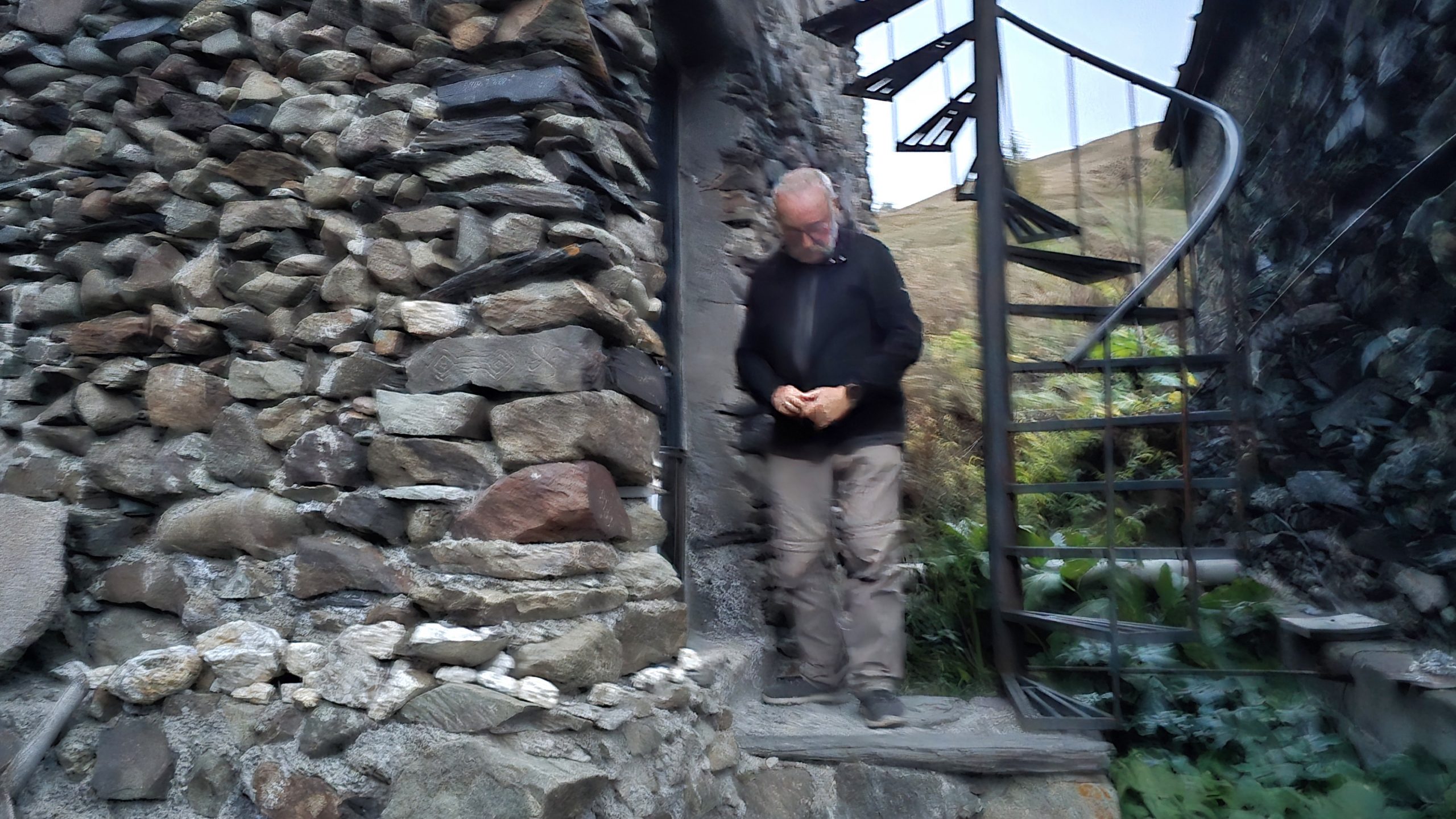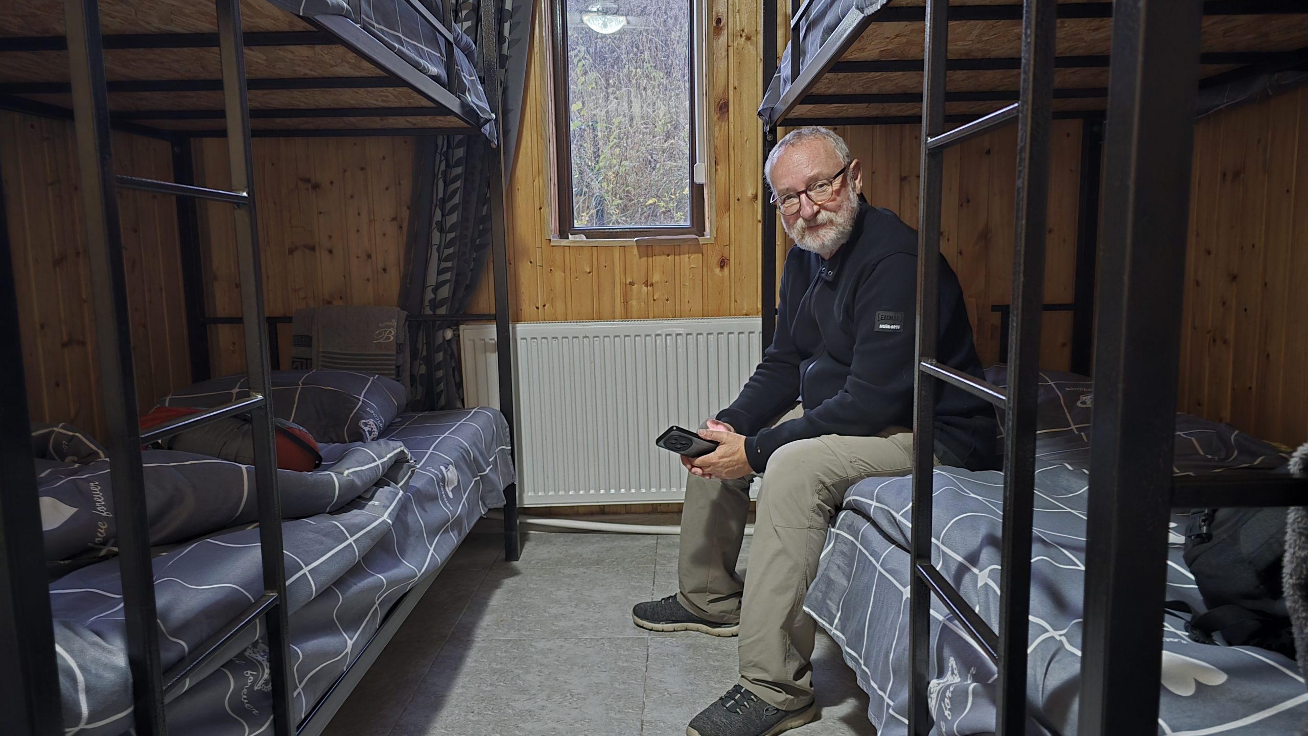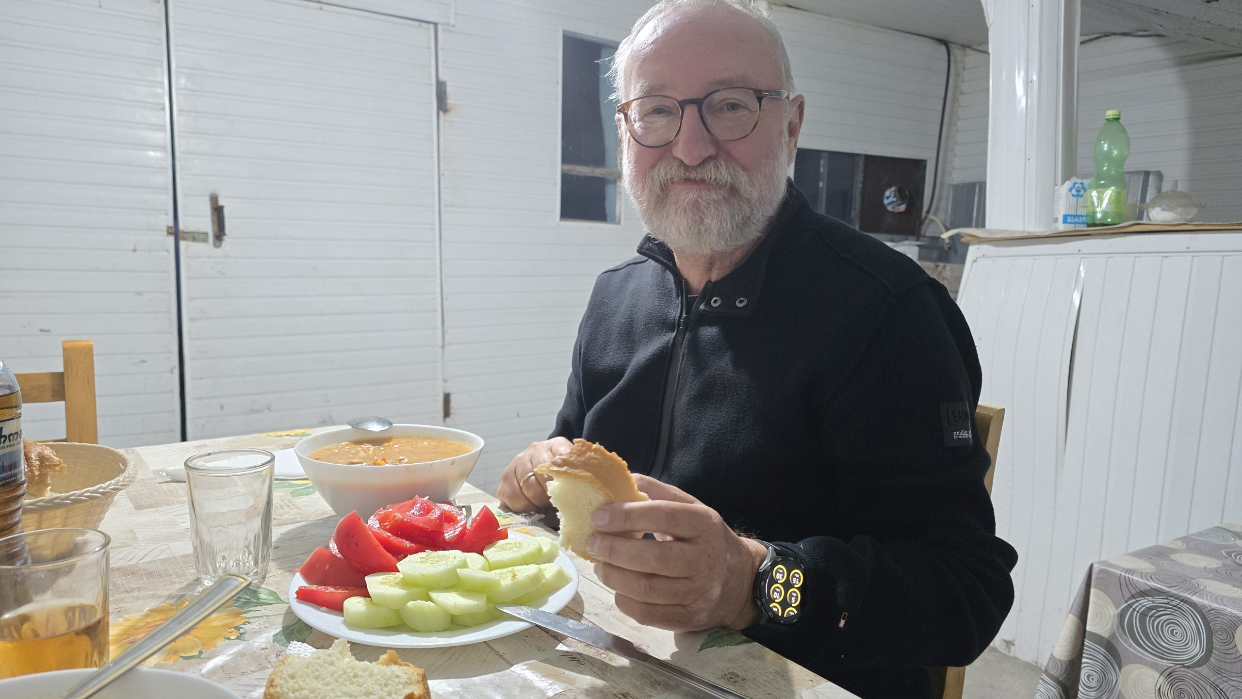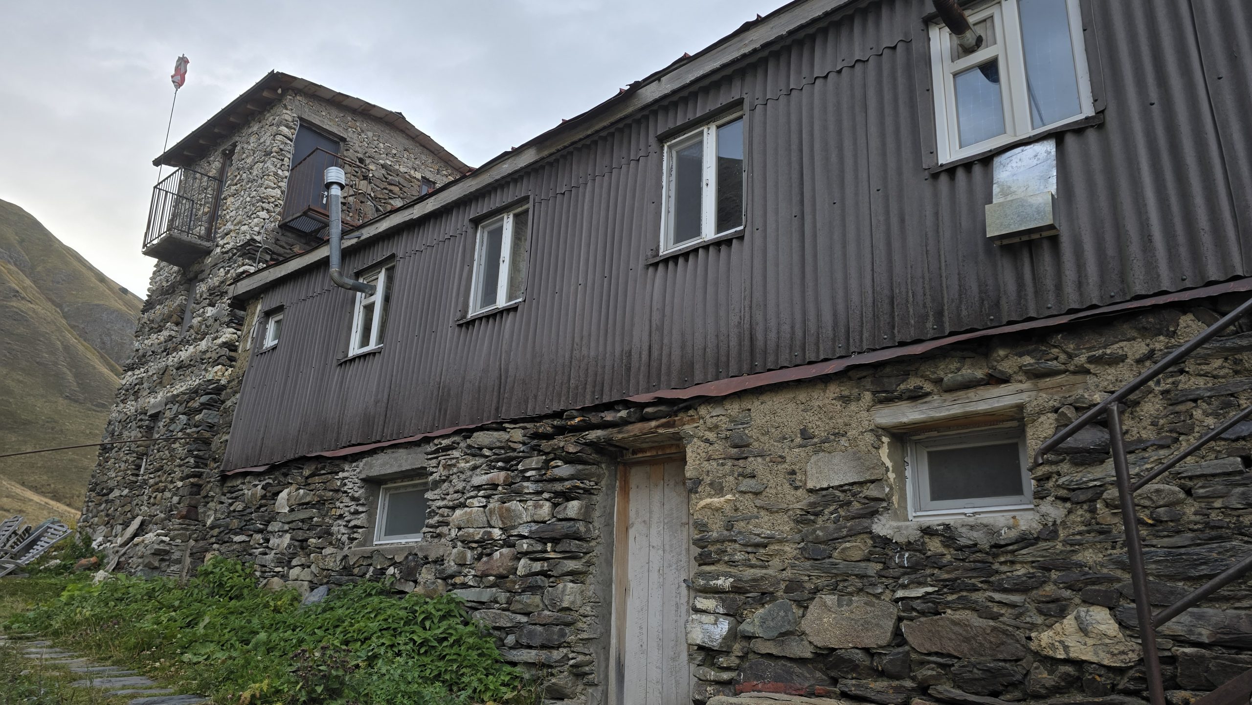 Wir buchen in Juta, unserem morgigen Wander- Standort, ein Hotel, von dem geschrieben wird, es sei der beste Ort Georgiens. So, da darf es mal etwas mehr kosten (es ist aber immer noch sehr preiswert). In weiser Voraussicht fahren wir im Hellen die als „gut ausgebaut“ beschriebene Schotterpiste bergauf in das Hochgebirgsdorf Juta. Manchmal ist mir nicht gut, denn es geht steil ab und manche Stellen sind verdammt eng. Aber es kommen uns tröstlicher Weise Autos entgegen. In dem kleinen Dorf müssen wir nochmals aufwärts und landen an einem ziemlich verfallenen Gehöft mit schönen Wehrturm. In der untersten Etage des Wehrturms sitzen wir nun und genießen die Heizung. Die Wirtin beköstigte uns mit einem halbwarmen, aber sonst wohlschmeckendem Hühnereintopf und saurem Wein, nachdem sie ihr Geld bekommen hatte. „Dawai“, war der Kommentar, das heißt „aber schnell“. Aus Versehen gehen wir vom Turm nicht gleich in die kalte Blechhütte, die als Speiseraum für die Gäste dient. Sondern landen in den warm- behaglichen Küche der Hausherrin, in der Essen schmort und geschnittene Tomatenberge sich zur Weiterverarbeitung türmen. Ein junger Mann sitzt in einer Ecke. Hier hätte ich lieber gespeist. Obwohl ich bei dem Anblick besser verstehe, warum unser Zimmer im Turm ein Hotel ist. Reiner schlägt in unserem Zimmer einen großen Käfer tot und ich bin froh, dass wir nicht draußen in der dunklen Bergwelt schlafen müssen.