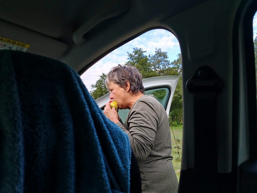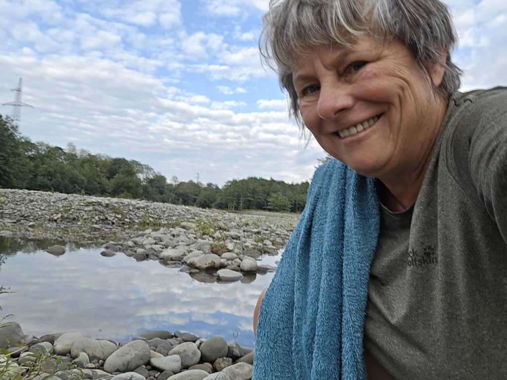 Zunächst starte ich mit einer Katzenwäsche an einem Becken in dem strömungsstarken Fluß. Ah, das tut gut. Da Reiner noch kränkelt muss ich allein essen. Brot, Käse, Birne und Granatapfel, aber letzterer schmeckt mir zu sauer.