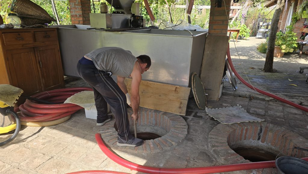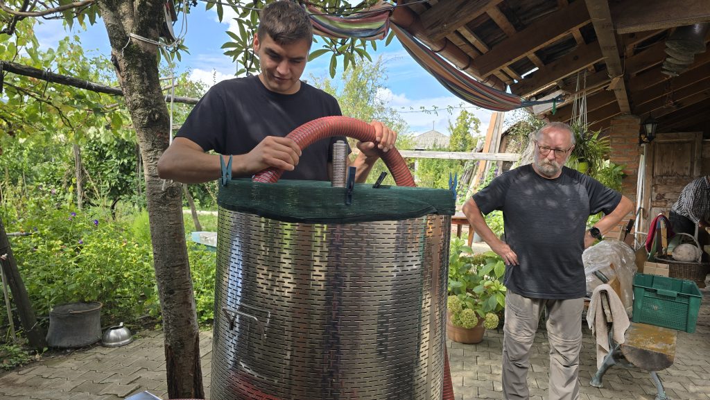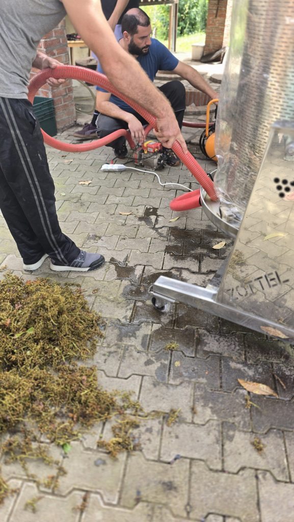 Vom Rapper kommen die Trauben in den Entsafter und vom Entsafter in die Amphoren.Misha hält den Schlauch, der vom Rapper in den Entsafter geht