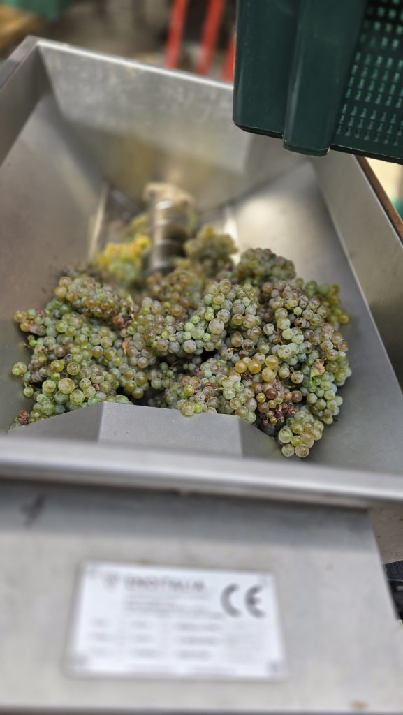 Der Chef schüttet die gestern geernteten Trauben in den Rapper, der wirft zur einen Seite die Trauben und zur anderen Seite die Strünke aus